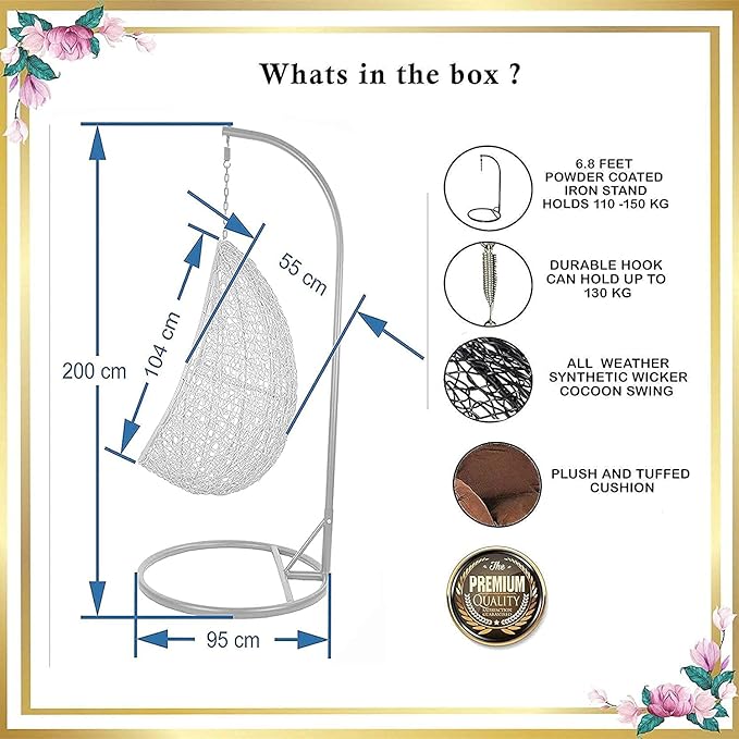 • Ideal for Deck, balcony & more - Unique swinging Chair is the perfect addition to any space outside, like a backyard patio, deck, in a sun-room or garden, or near a pool, or outdoor bar • Premium Fluffy Cushion - It comes with a Soft deep fluffy cushion, perfect for you to snuggle in on a warm and sunny day, with a book and a cold coffee • User Indoor or Outdoors - It is sturdy & safe for you to sit in, and it will be a great addition to your indoor or outdoor furniture • All-Weather Construction - Constructed from poly nylon wrapped around a heavy iron frame for weather protection, strength and durability • Hand WOVEN and Hand CRAFTED WICKER: Add a playful look to your patio with this outdoor hanging swing stand chair for adults. Deck up your balcony with this all-weather synthetic wicker with a powder-coated iron frame. The heavy-duty antique bronze finish swing can hold upto 110-130 kgin weight. Your garden or living room will look stunning with this swing chair. Enjoy the outdoors with this easy to manage patio decor in any weather