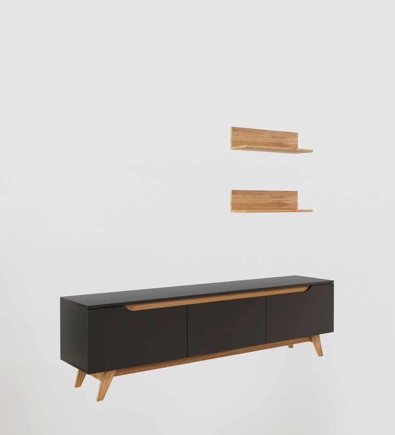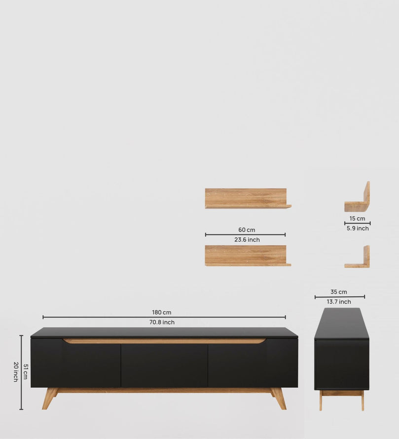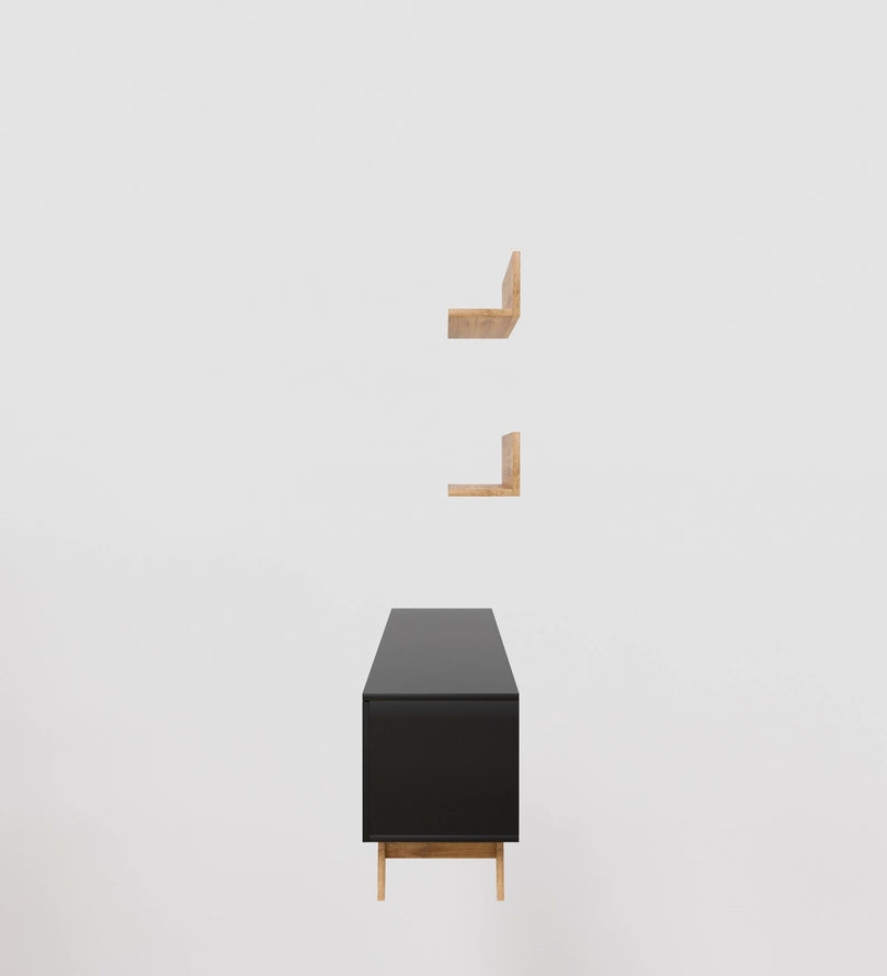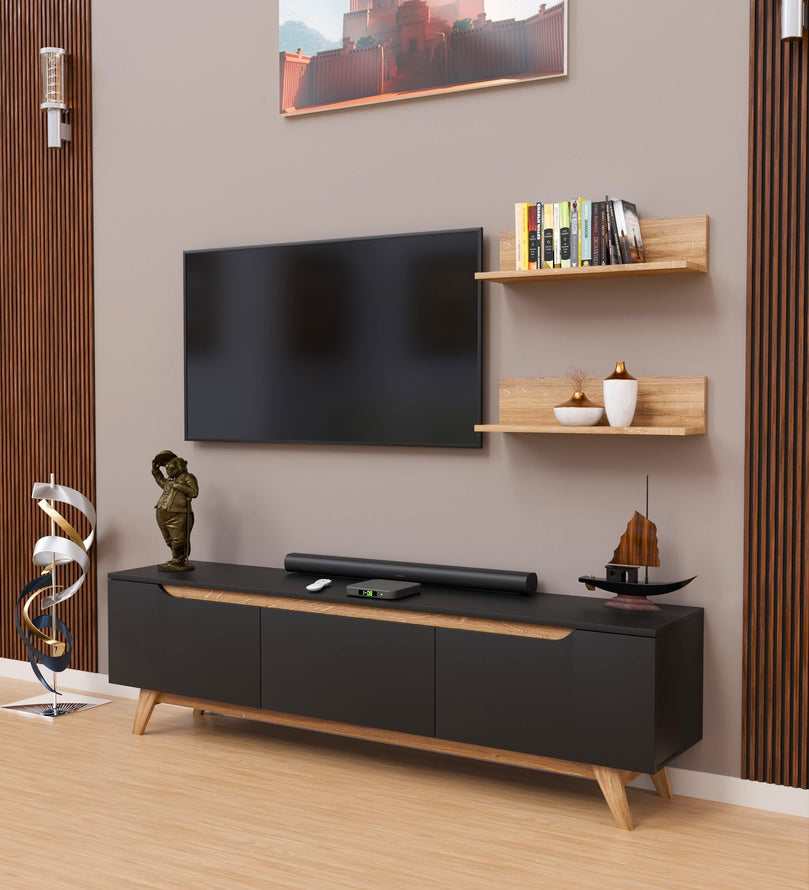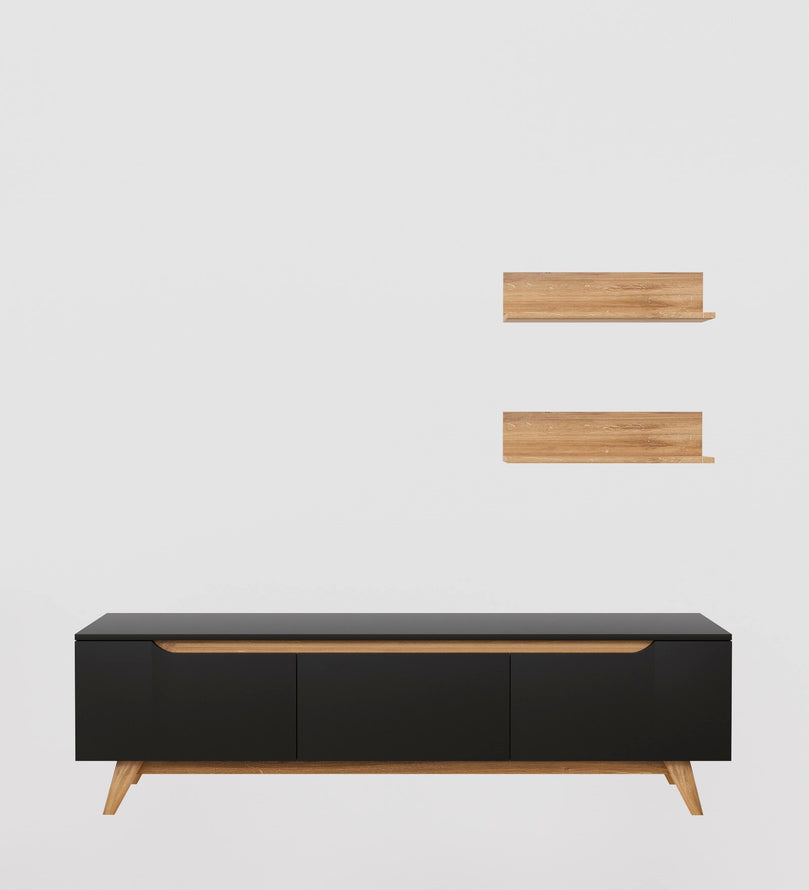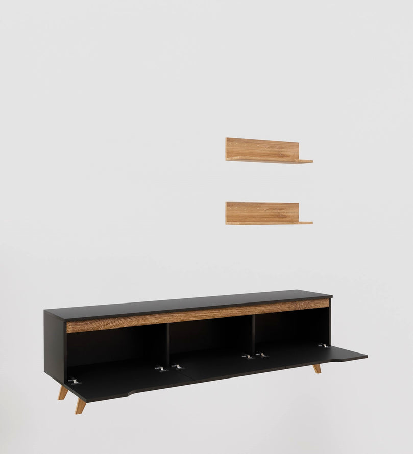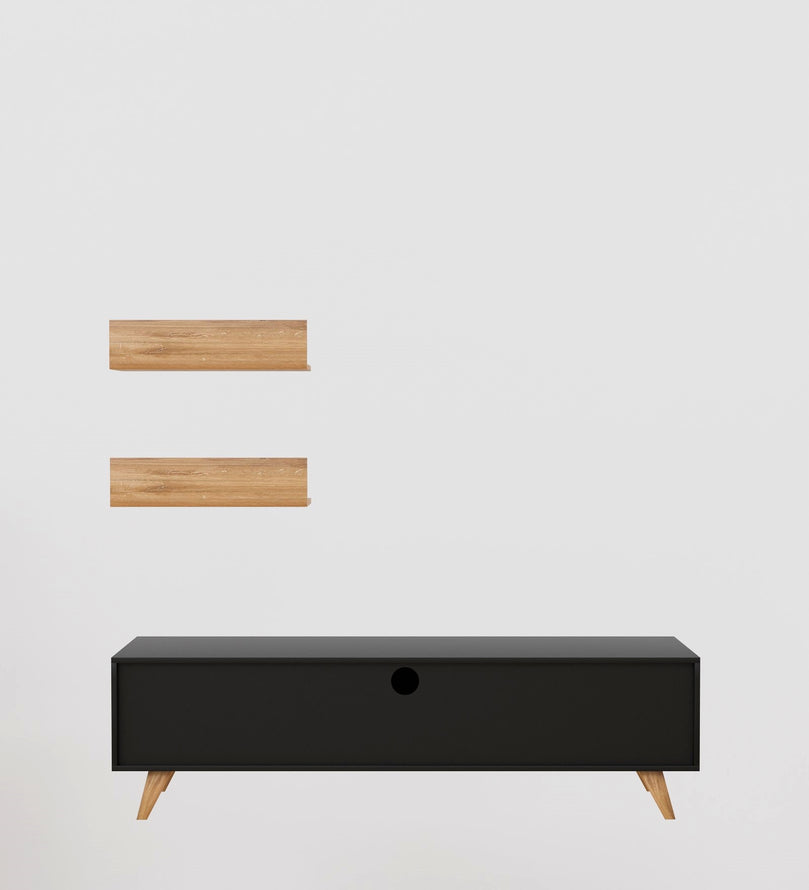 The natural wood grain texture of Canyon Oak contrasts beautifully with the matte black panels, creating a contemporary, high-end look. The unit is constructed from premium engineered wood, ensuring durability and long-lasting performance. A dedicated wire cut-out keeps cables organized for a clean and seamless look, while the angled wooden legs provide excellent support and complement the unit's modern design.