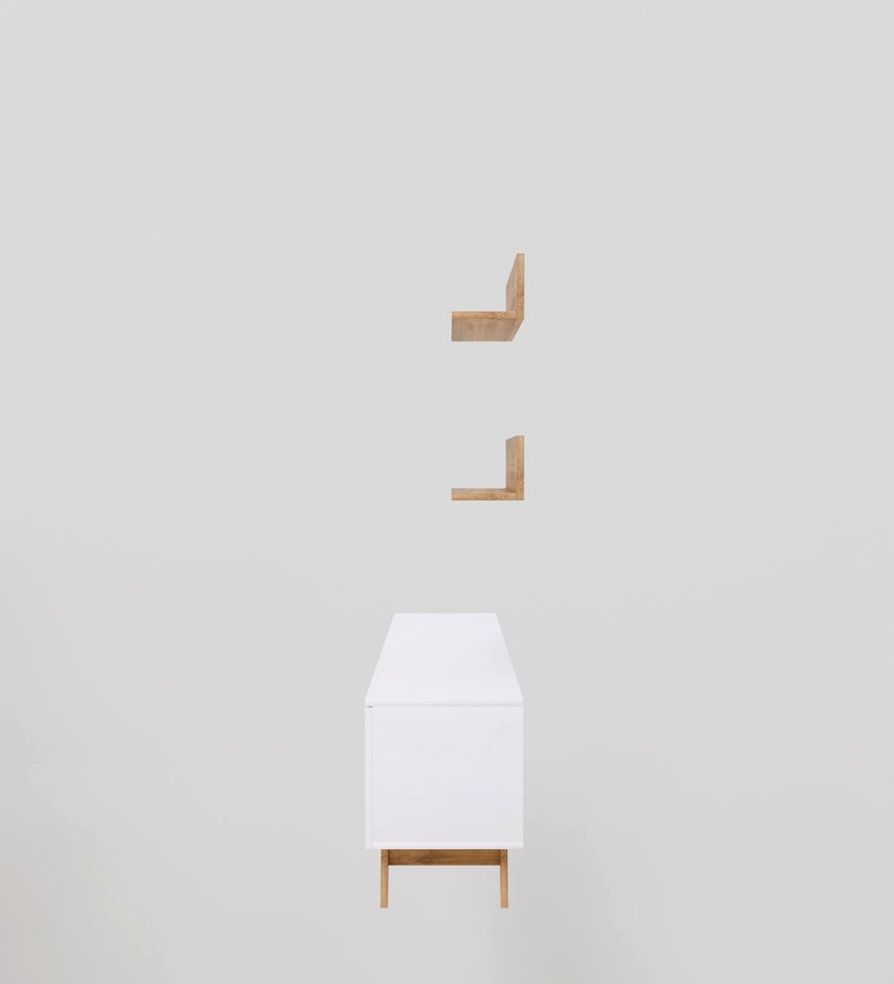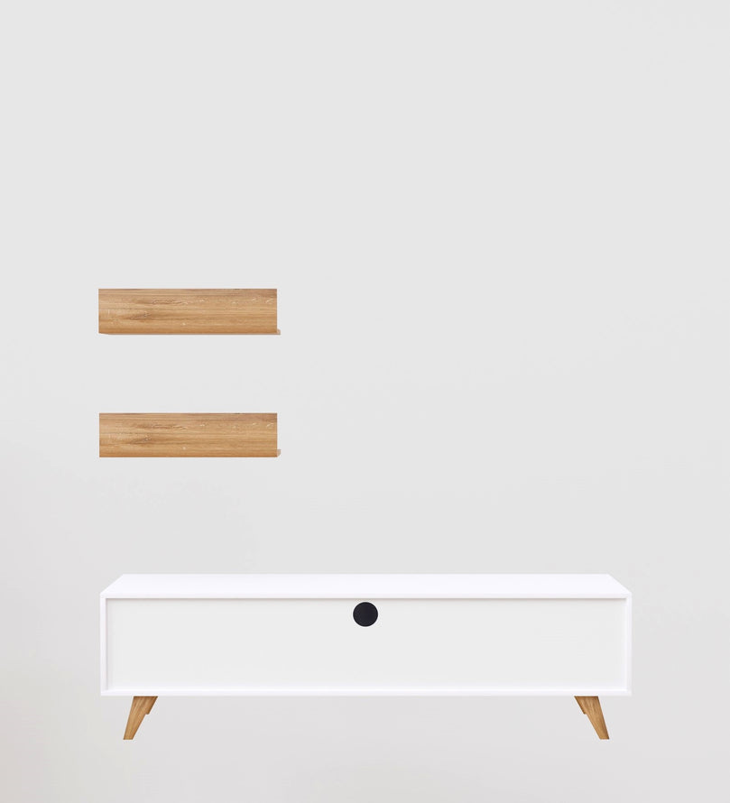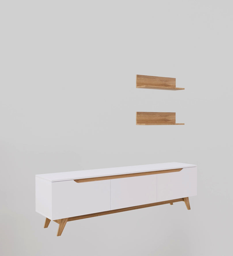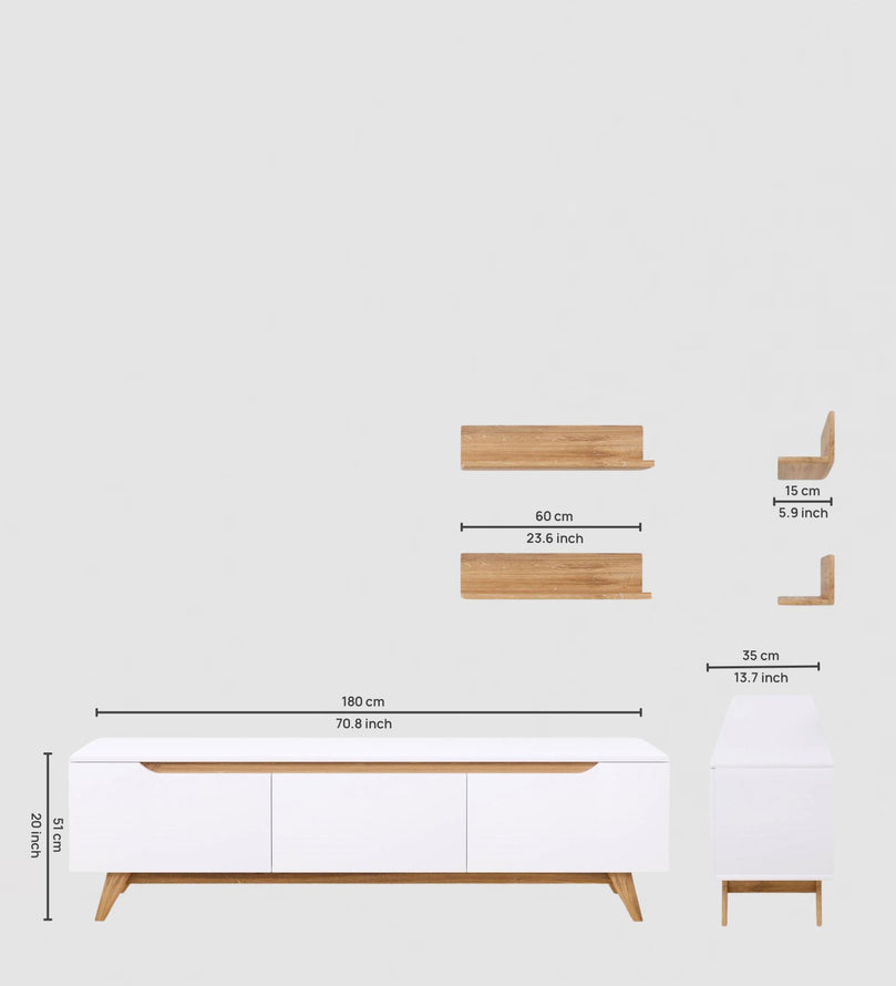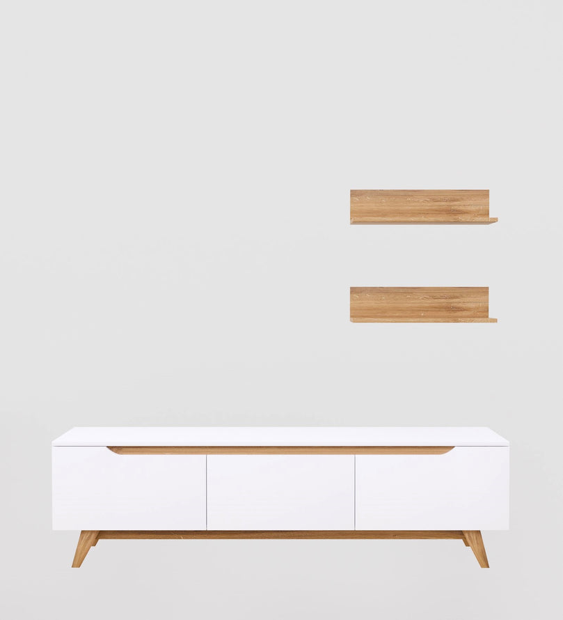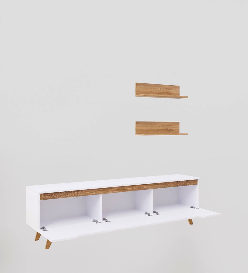 Upgrade your living space with this elegant White & Canyon Oak TV Unit, designed to bring a fresh, modern touch to your home. The sleek white panels contrast beautifully with the warm Canyon Oak wood finish, creating a stylish and inviting aesthetic. With ample storage space, closed cabinets, and floating shelves, this entertainment center is perfect for organizing media essentials while displaying decorative accents.