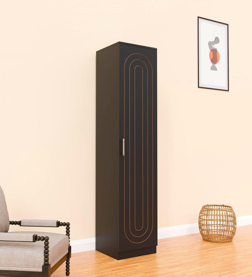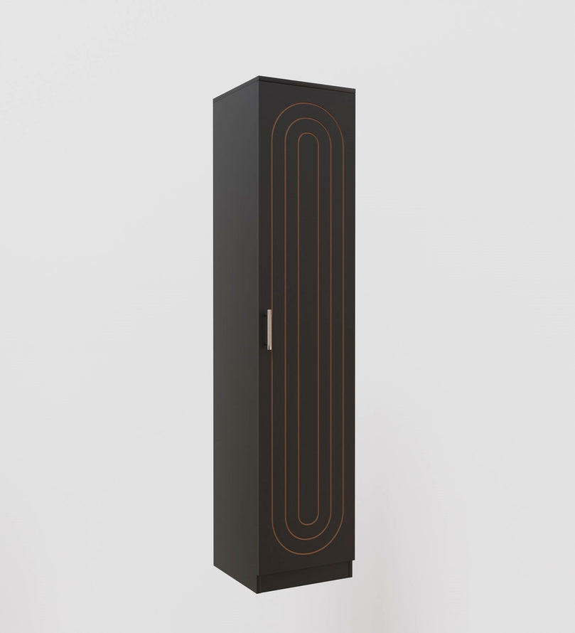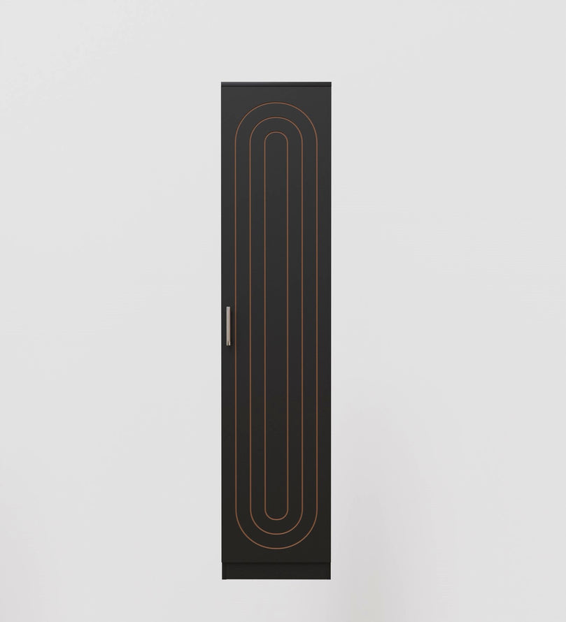 Elevate your home décor with this sleek and modern single-door wardrobe, designed to blend effortlessly into any space. Crafted with a premium matte black finish, this wardrobe features elegant copper-toned geometric patterns that add a touch of sophistication and style. The slim design is perfect for compact spaces such as bedrooms, entryways, or offices, offering a chic storage solution without occupying much floor area.
