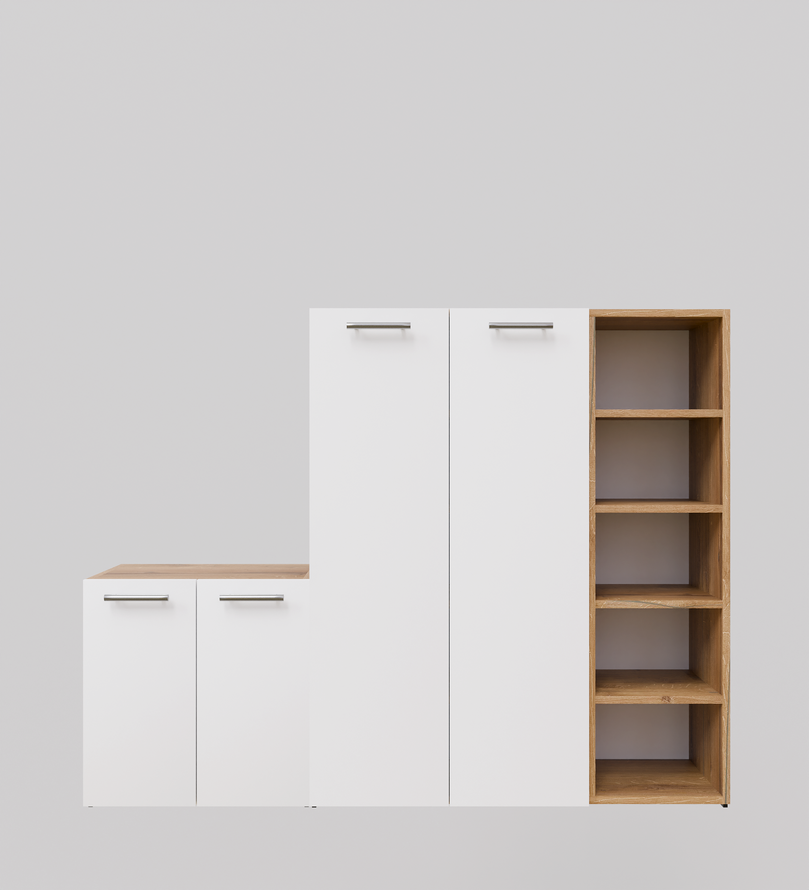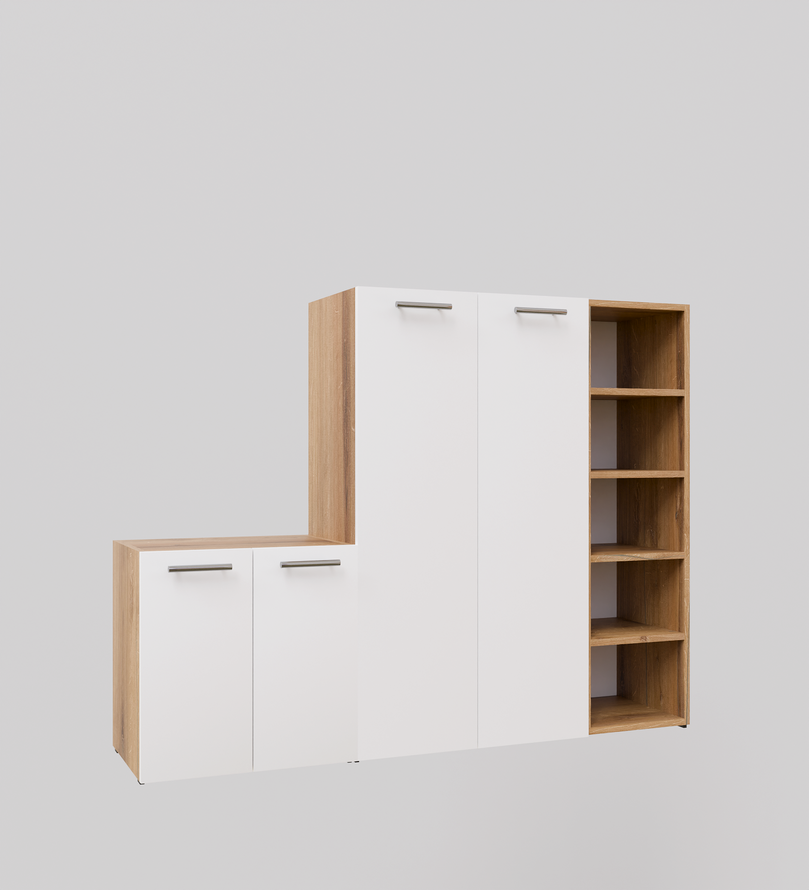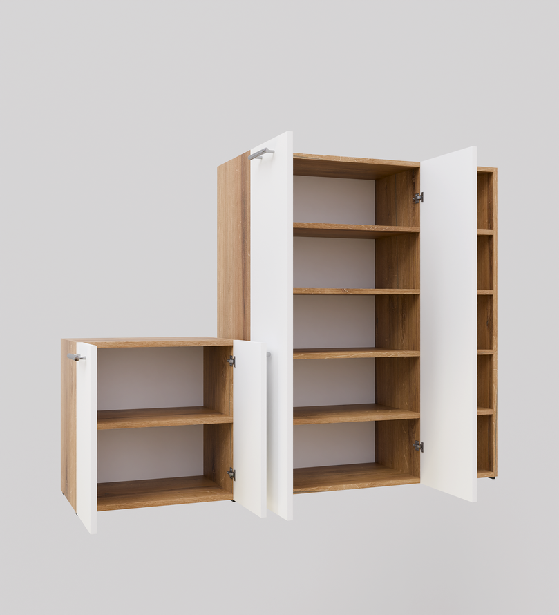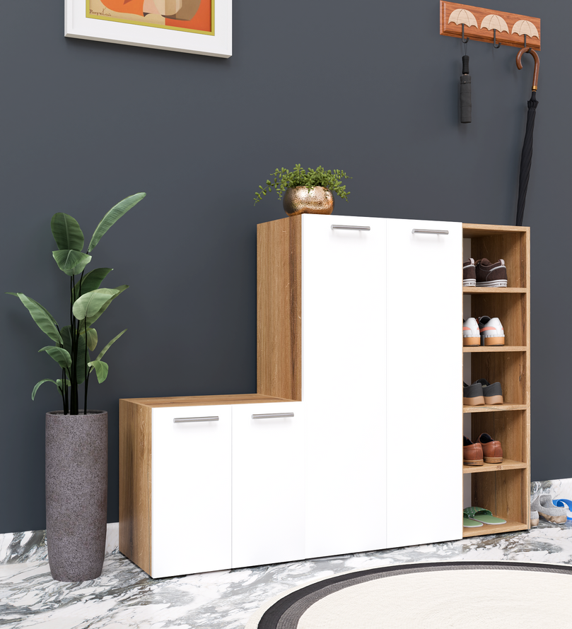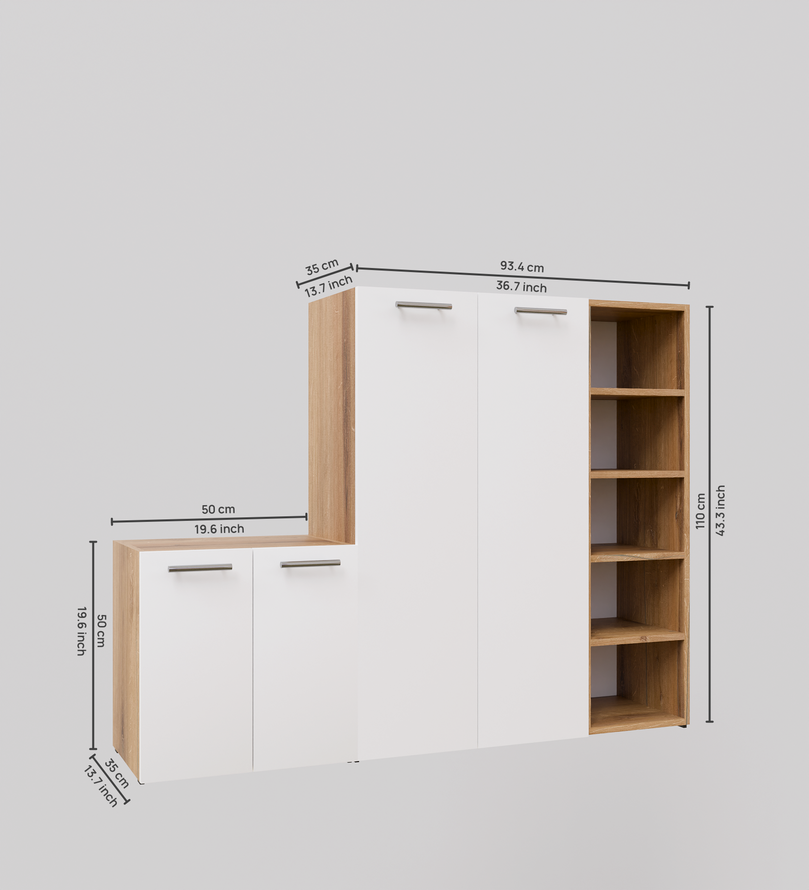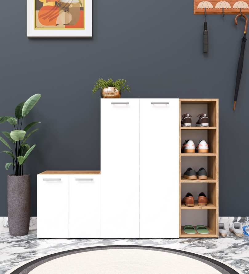 Organize your footwear collection in style with the Louis Shoe Rack, a versatile and elegant shoe storage solution designed to fit seamlessly into modern homes. Featuring a striking combination of clean white doors and a natural wood finish, this shoe rack not only enhances the aesthetics of your entryway or hallway but also provides ample storage to keep your space neat and clutter-free.