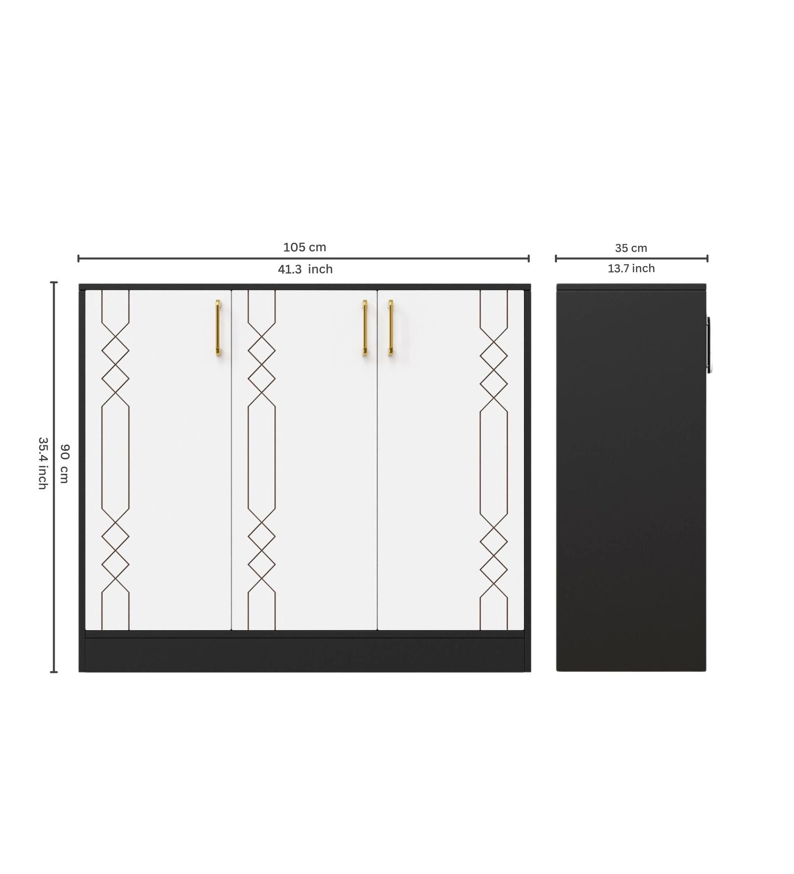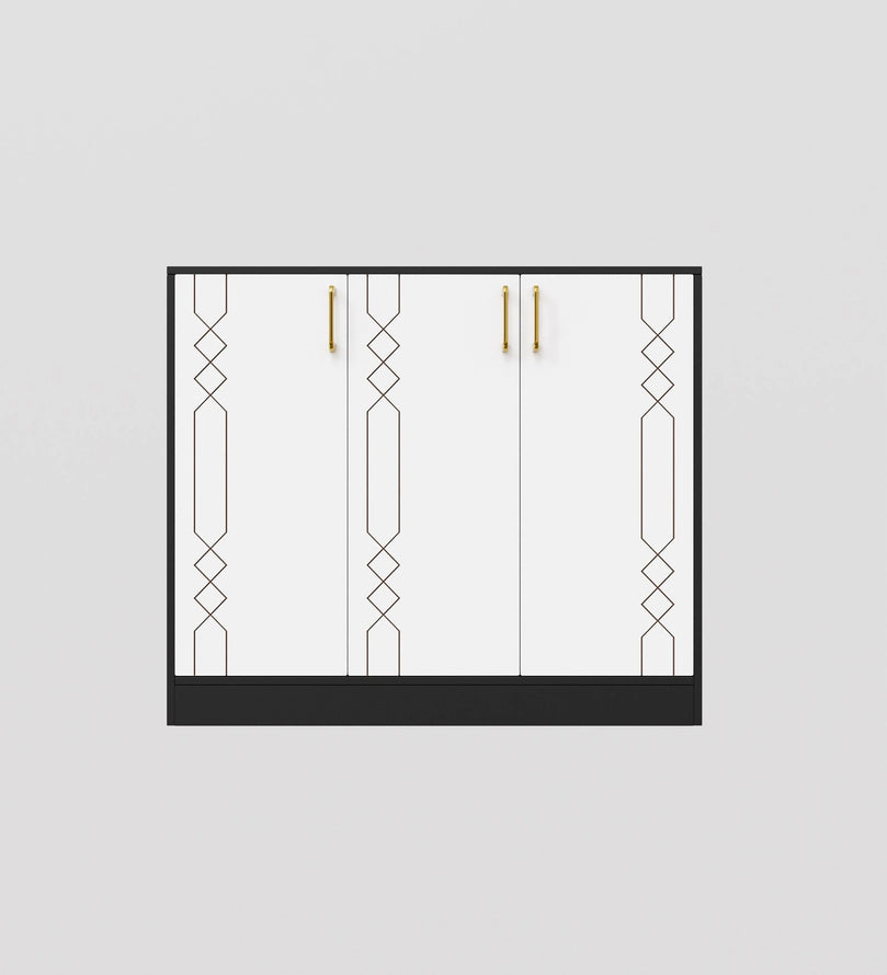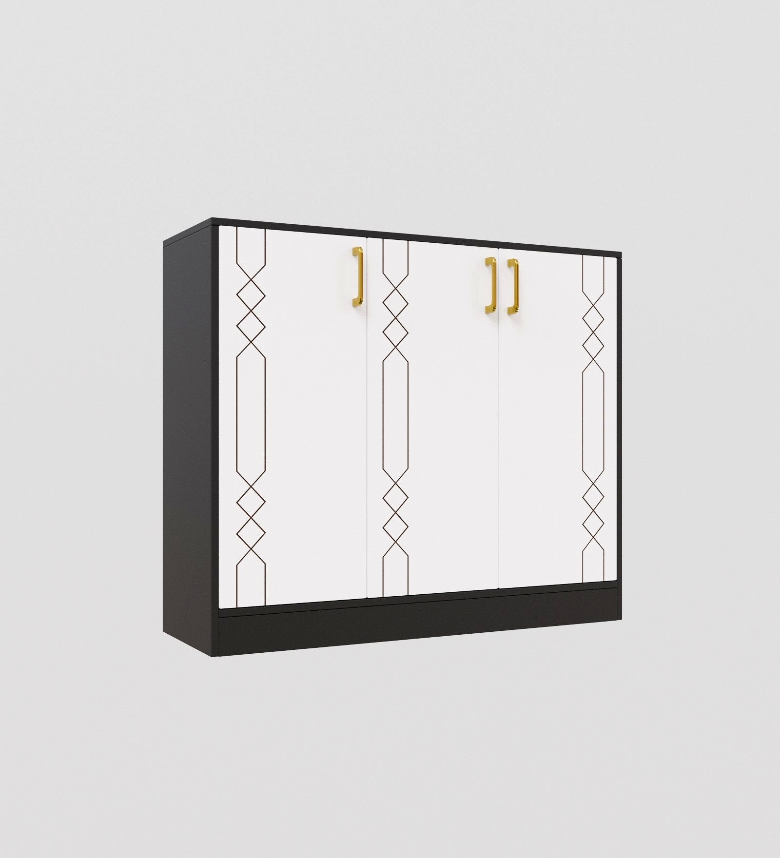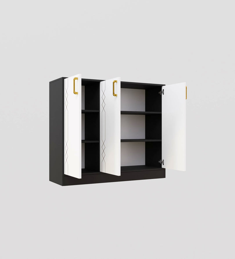 Add modern elegance to your space with the Spydercraft Multipurpose 3-Door Cabinet, now in a striking White and Black finish. This stylish cabinet features a bold monochrome color palette paired with detailed geometric grooves and metallic gold handles, offering a perfect blend of utility and design.