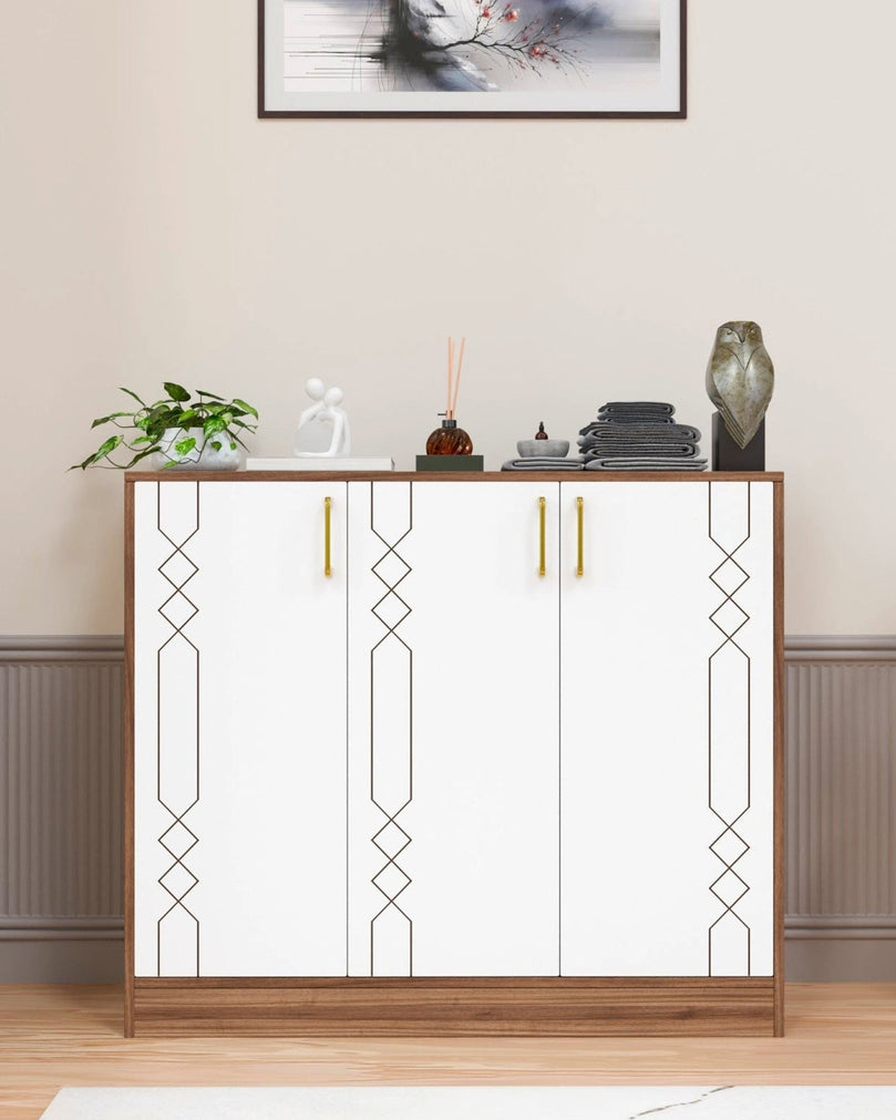 Introduce a touch of elegance and practicality to your interiors with the Spydercraft Multipurpose 3-Door Cabinet, now in a sophisticated White and Noce Lyon finish. The beautiful contrast between crisp white and warm wood grain, enhanced by intricate geometric grooves and sleek gold handles, makes this cabinet a standout addition to any room.