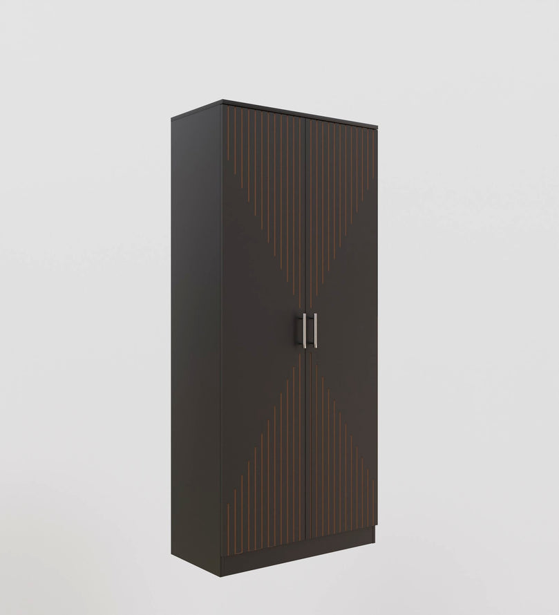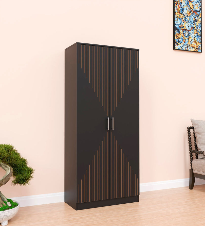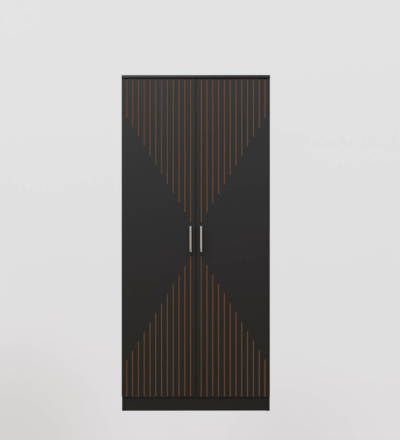 Elevate your bedroom or dressing space with this sleek and stylish 2-door wardrobe that perfectly blends modern aesthetics with practical functionality. Finished in a bold matte black, the wardrobe is accented with elegant vertical gold-toned grooves that form an eye-catching X-pattern design across the doors—adding a touch of sophistication and luxury.