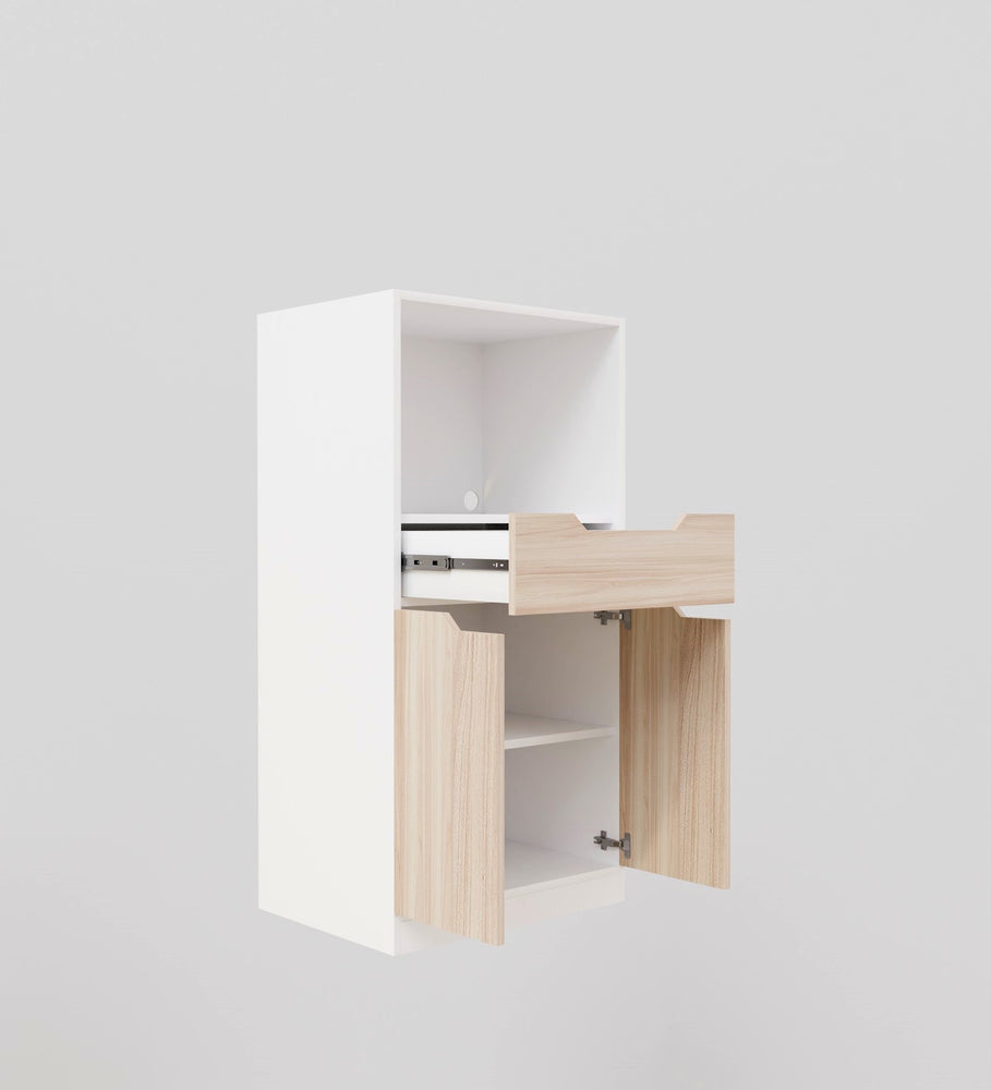 The cabinet features a sleek and elegant design with a rich wood finish in Asian walnut light and a crisp white color. This combination adds a touch of sophistication to any kitchen décor.