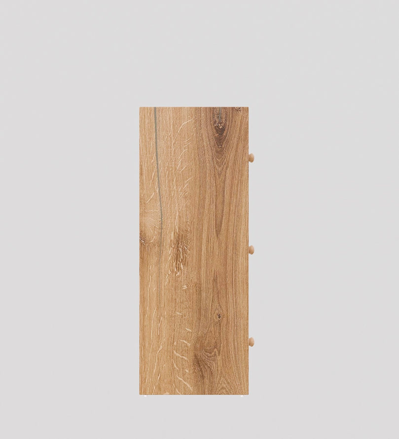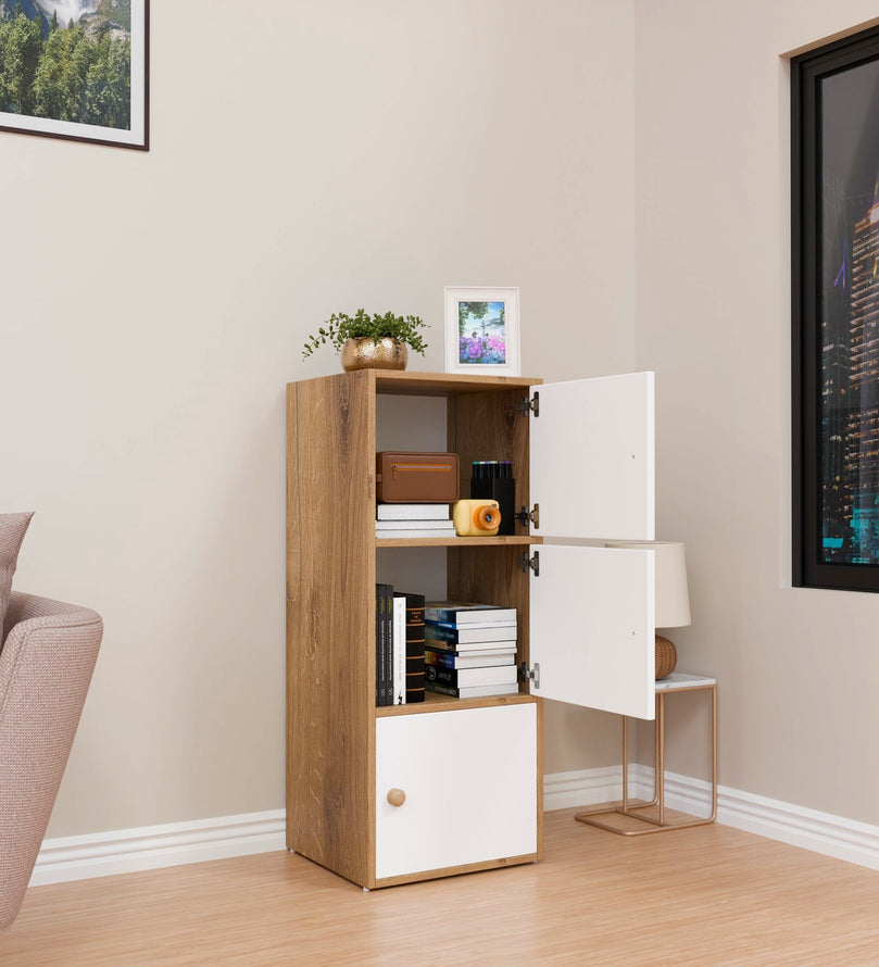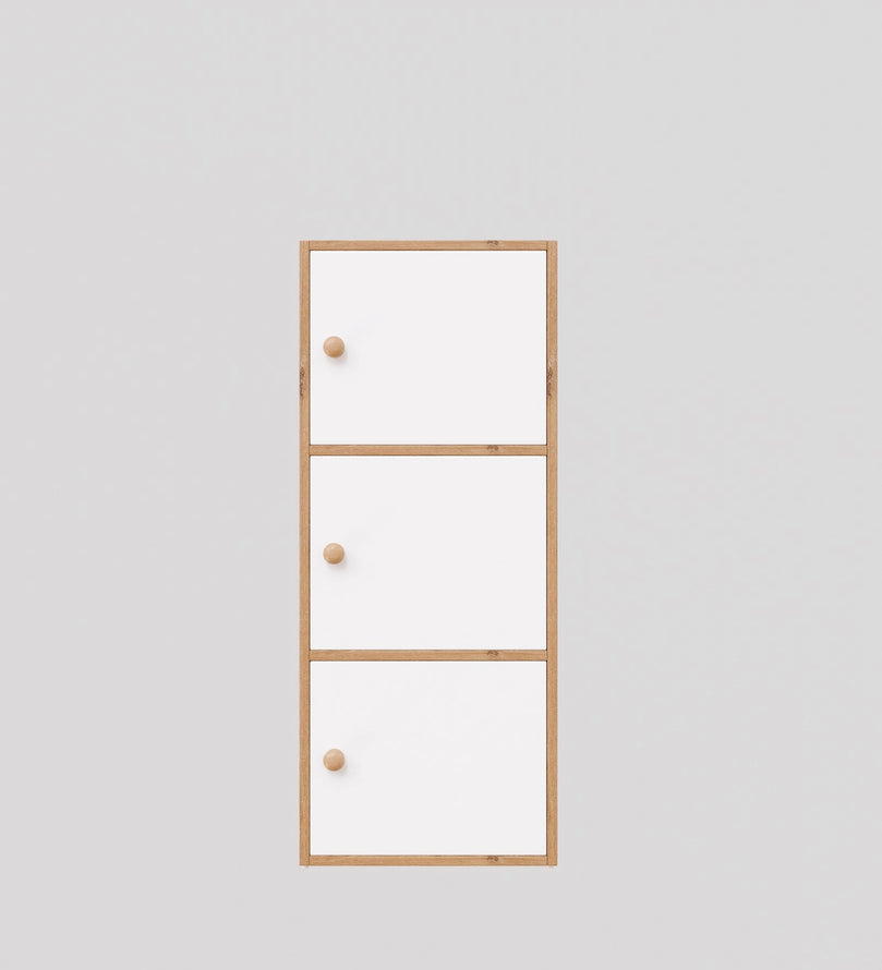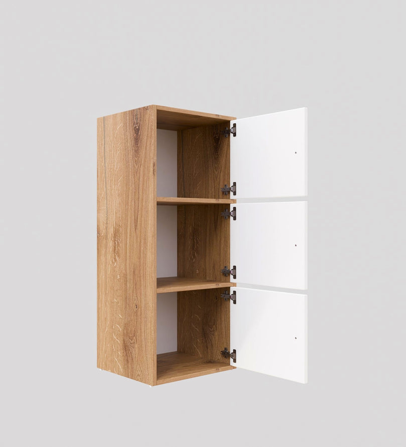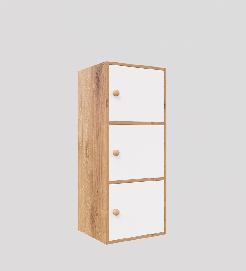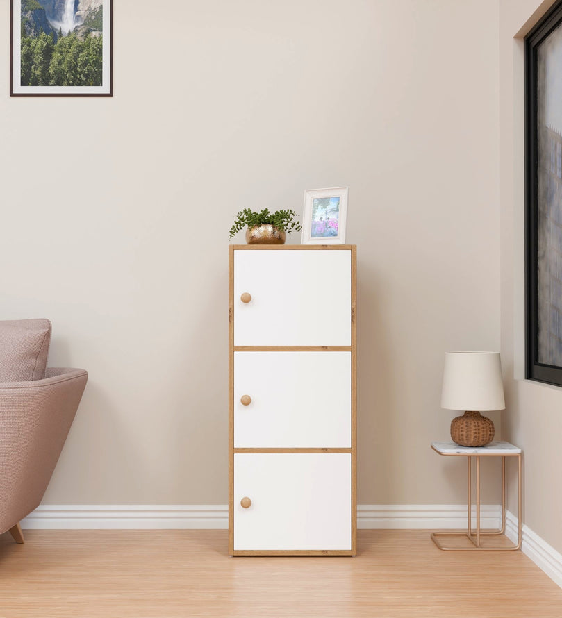 This modern 3-door storage cabinet in an elegant Canyon Oak and white finish is the perfect blend of style and functionality. Its sleek and space-saving design makes it an excellent solution for homes, offices, and apartments. With three spacious compartments, it provides ample storage for essentials like books, shoes, kitchenware, office supplies, or accessories. The closed-door design keeps items dust-free and neatly concealed.