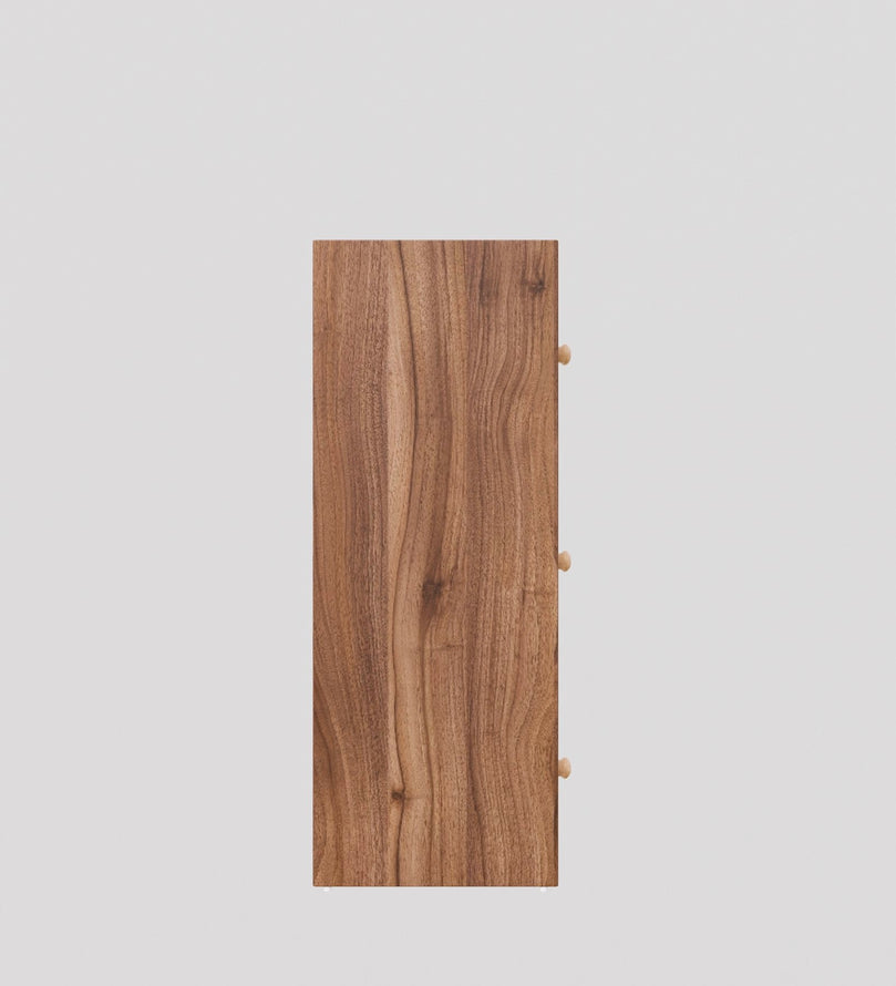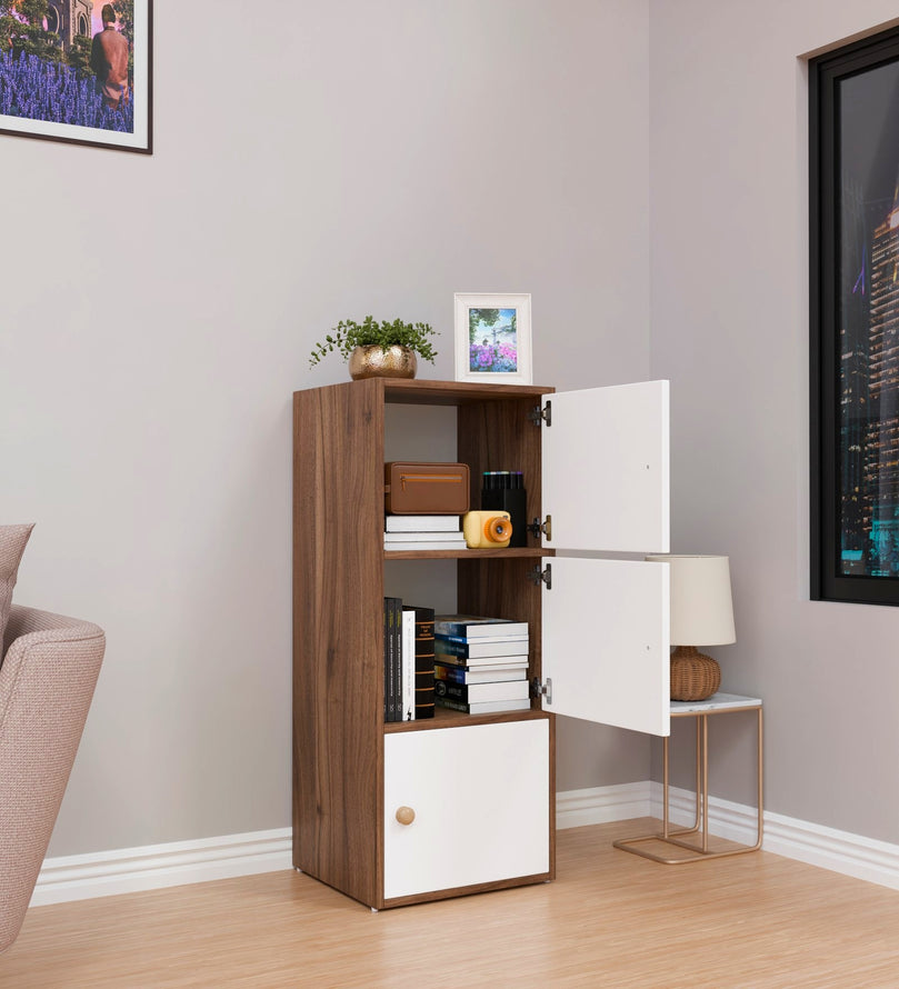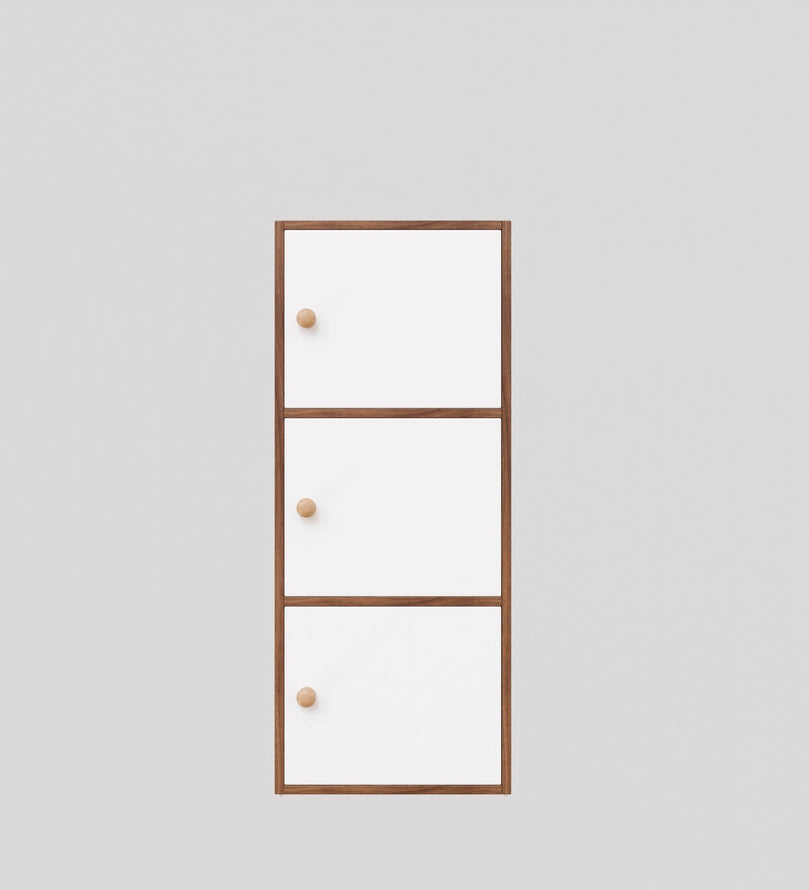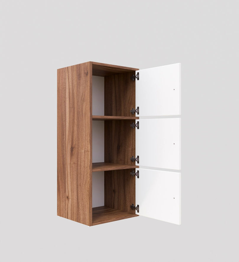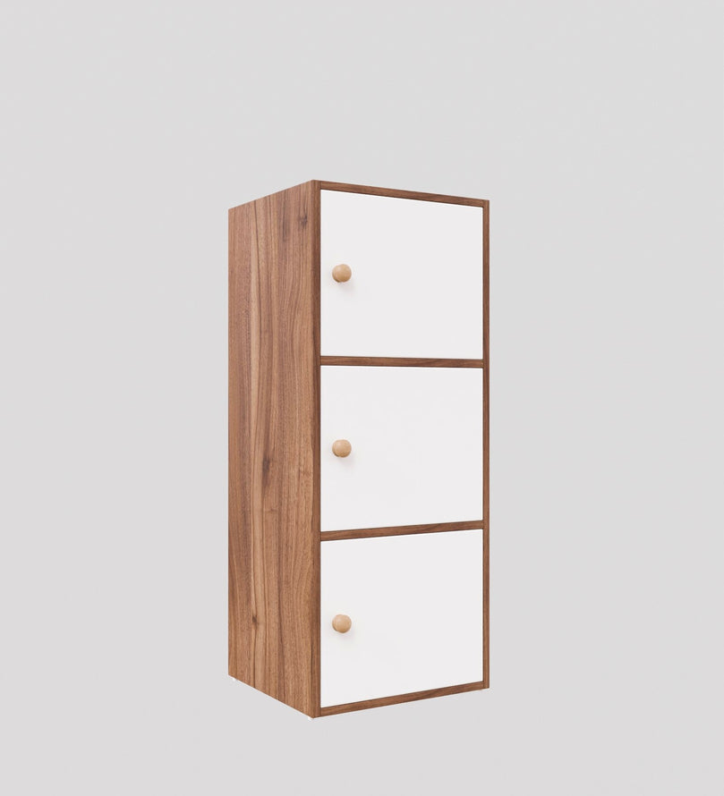 This modern 3-door storage cabinet in an elegant Noce Lyon and white finish combines functionality with contemporary aesthetics. Its compact vertical design makes it an excellent space-saving solution for homes, offices, and apartments.
