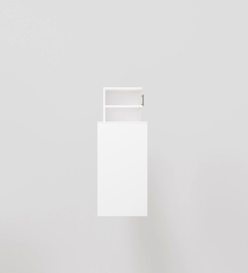 A tall white door with a modern silver handle conceals additional storage space, ideal for items you'd prefer tucked away.