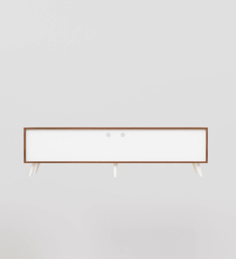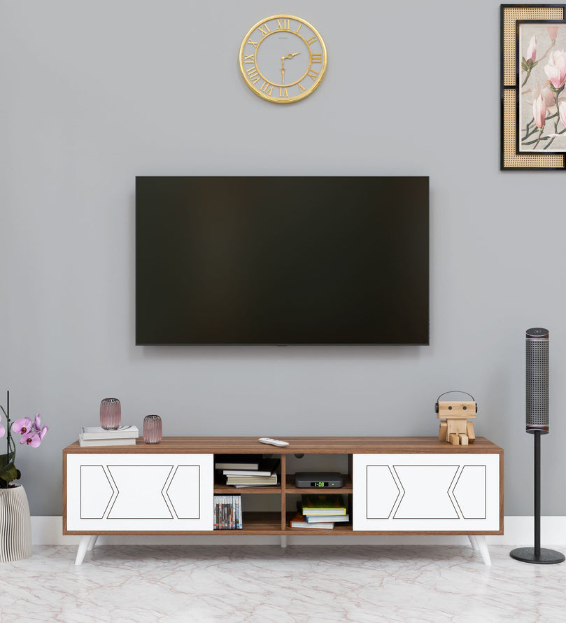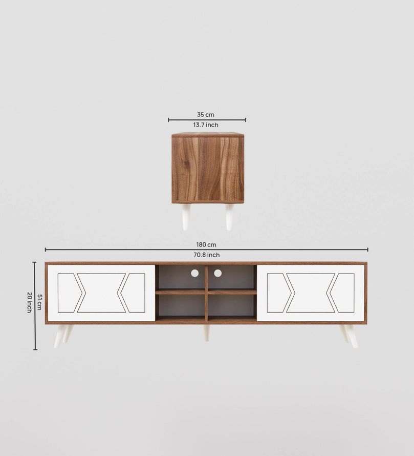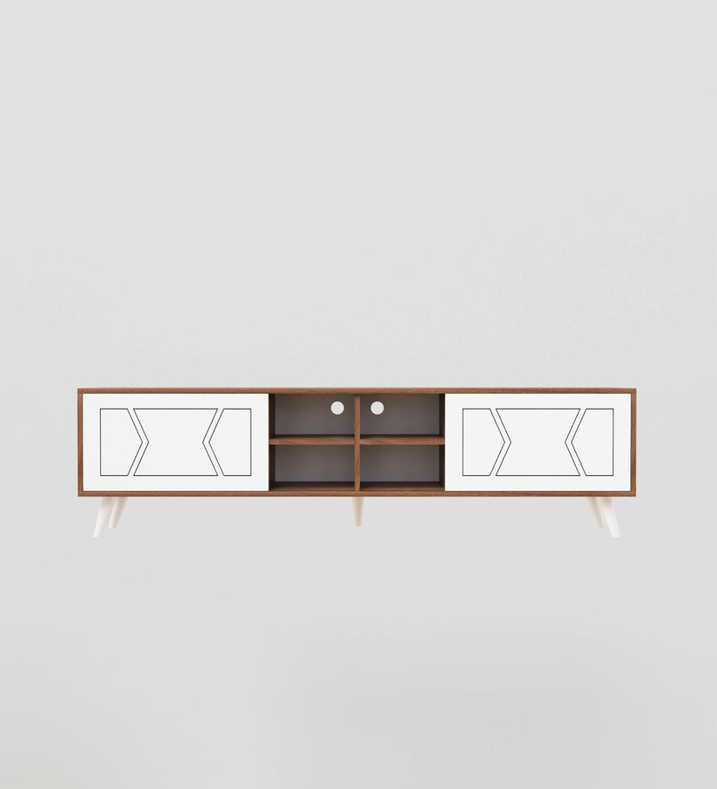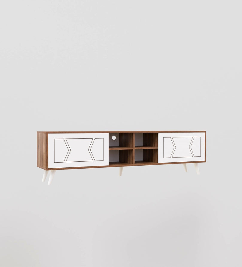 This sleek and stylish wooden TV unit is the perfect addition to any modern home. Crafted with high-quality engineered wood, it offers both durability and a sophisticated look. The unit features two spacious closed cabinets with intricate geometric patterns on the white doors, adding a touch of elegance to its design. These cabinets are perfect for storing items like DVDs, remote controls, and other essentials, keeping your space clutter-free.