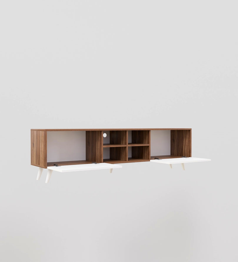 The center section of the TV unit consists of open shelves, providing ample space for organizing your set-top box, gaming console, books, or decorative pieces. The smartly designed back openings also allow for easy cable management, keeping wires neat and hidden. This compact and versatile unit is perfectly sized for modern homes, fitting seamlessly into small or large spaces.