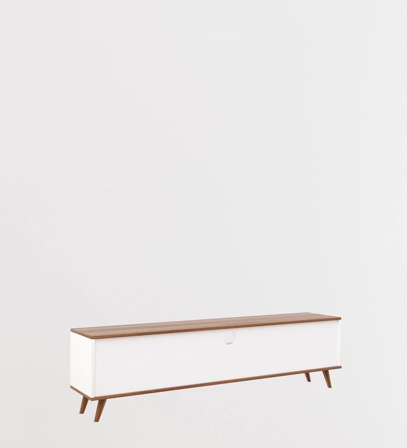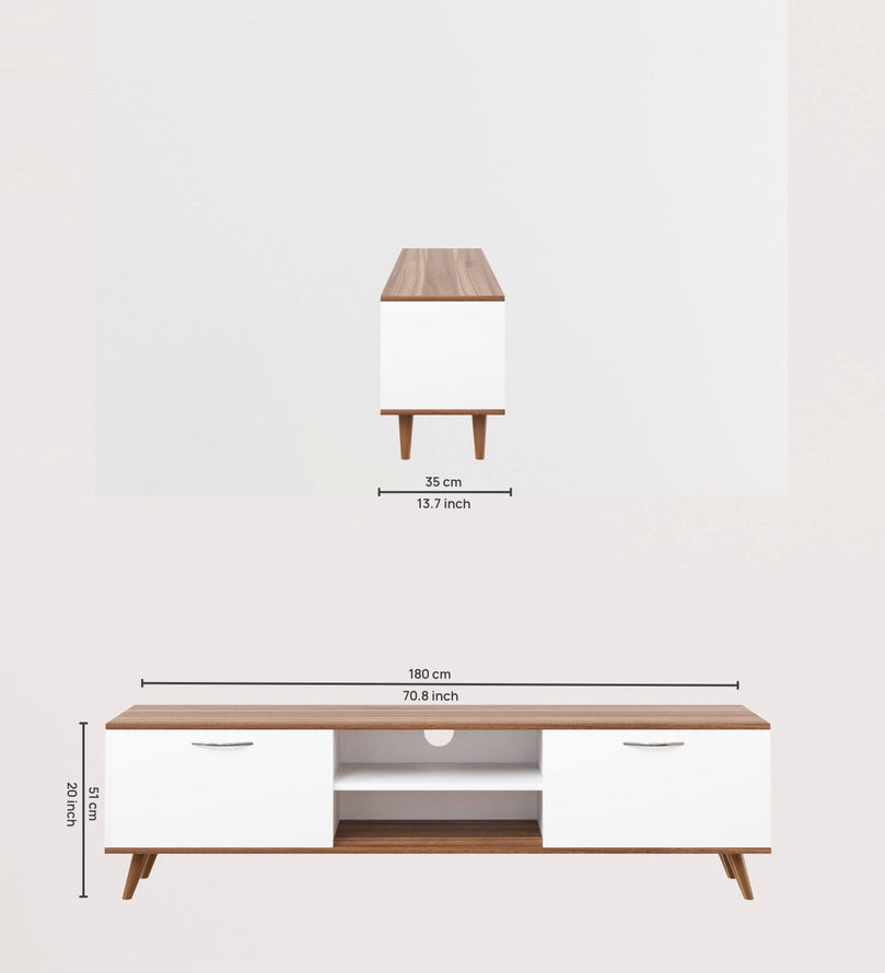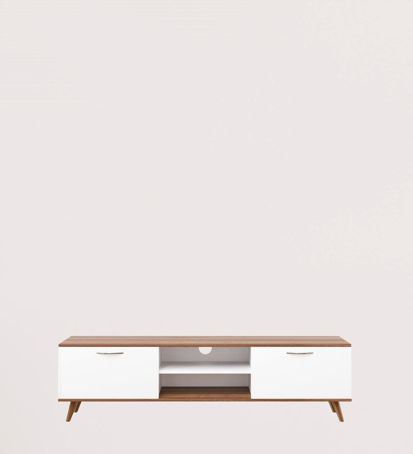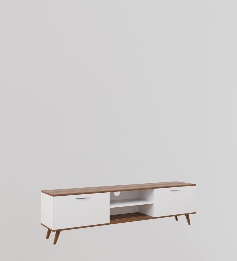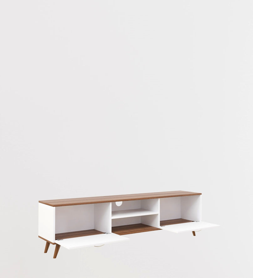 Upgrade your entertainment area with this stylish mid-century modern TV cabinet. Featuring a sophisticated white and wood finish, this cabinet offers both functionality and elegance, making it a perfect addition to any living room. With ample storage and an open shelf for media devices, this cabinet keeps your space organized and clutter-free while adding a touch of modern flair.