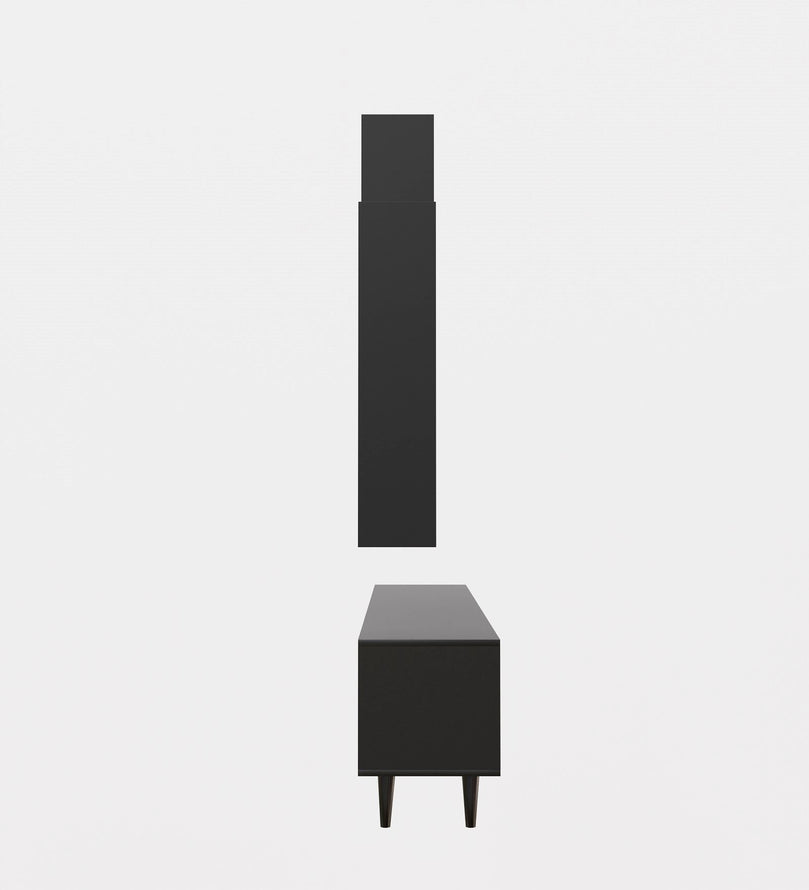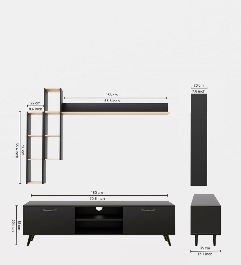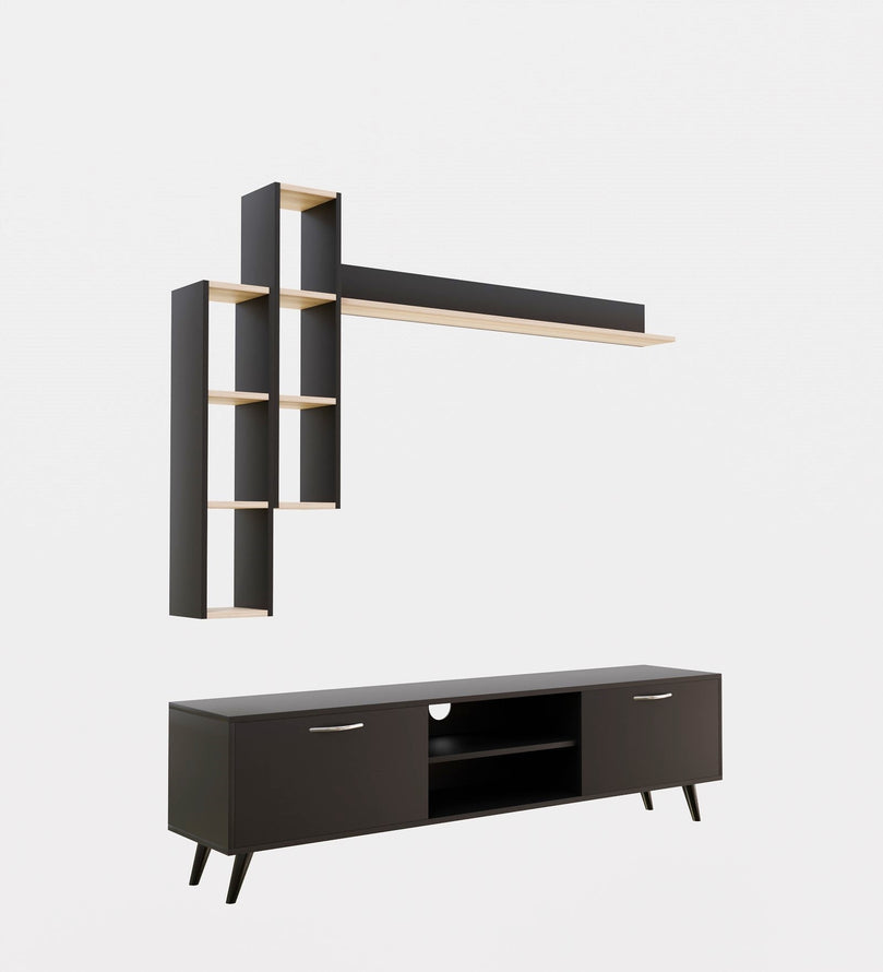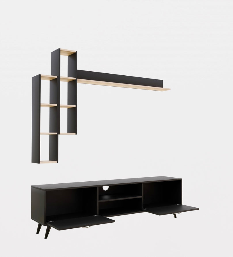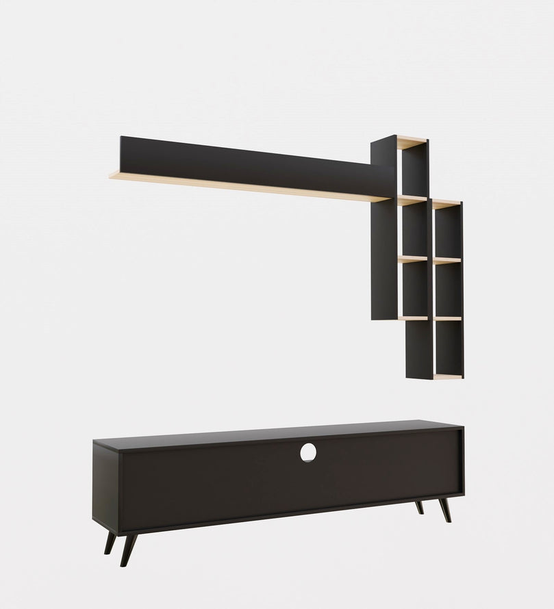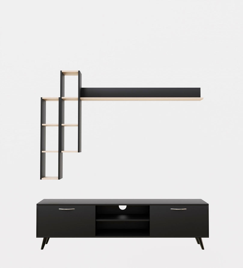 Upgrade your living space with this sleek and stylish Black TV Unit, designed to add a modern and sophisticated touch to your entertainment area. With ample storage, floating wall shelves, and a bold black finish with natural wood accents, this unit provides a perfect blend of elegance and functionality. Whether you need to organize media essentials or showcase decorative pieces, this versatile entertainment center enhances the aesthetics of any contemporary home.