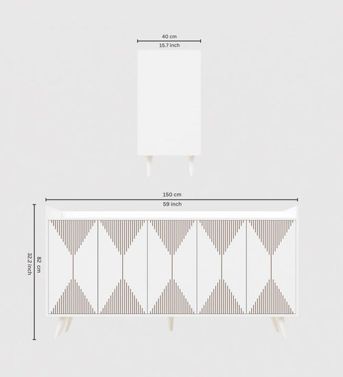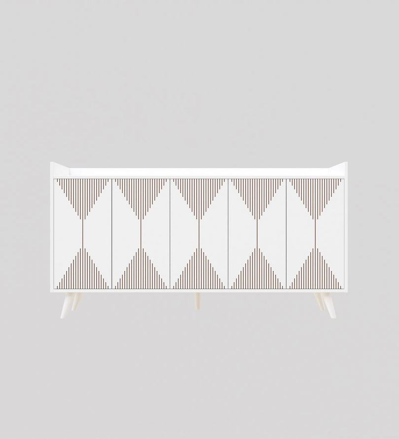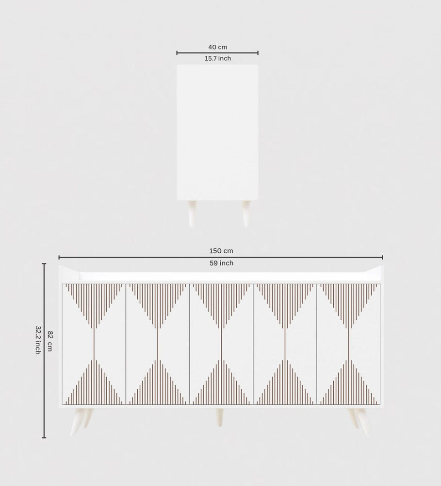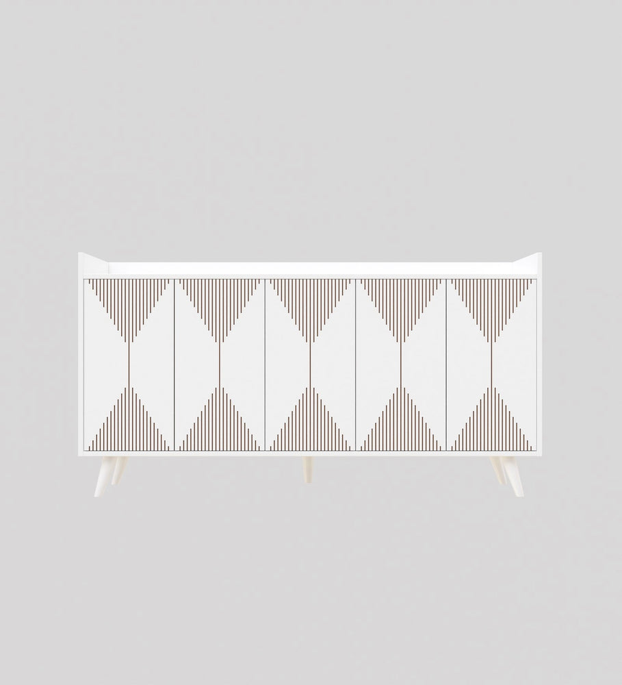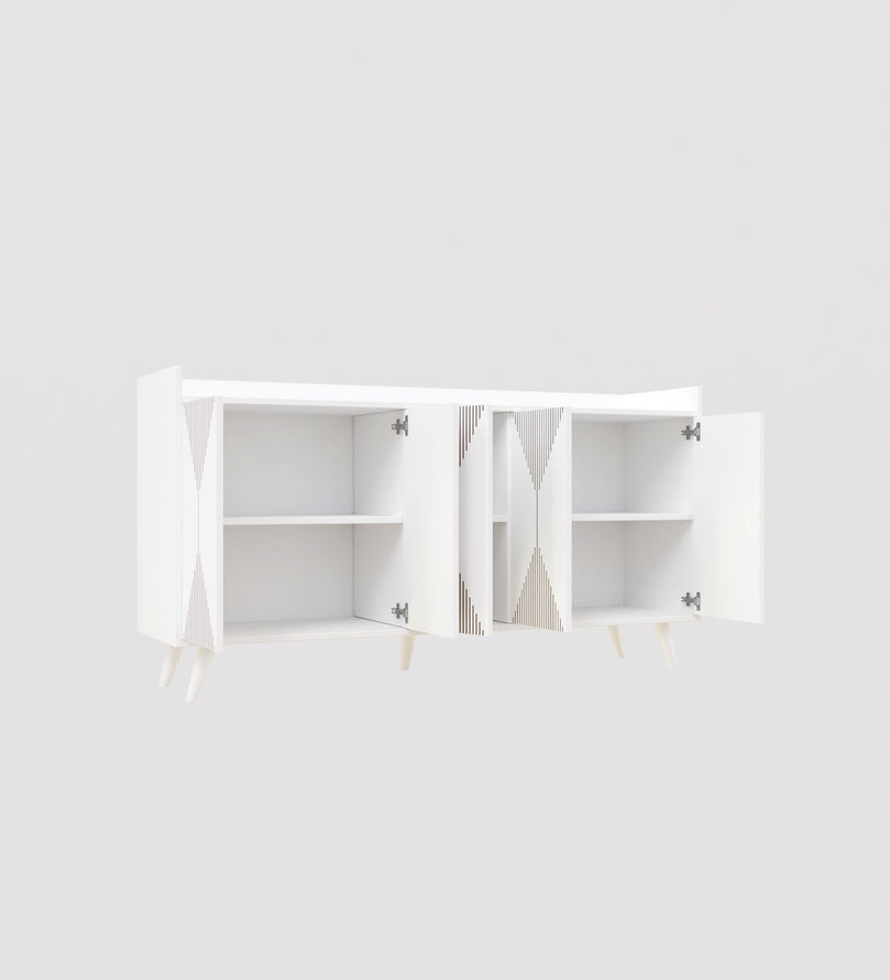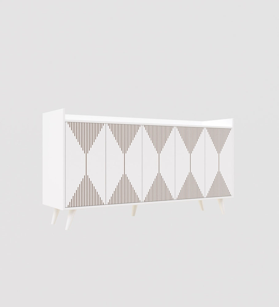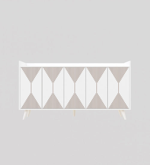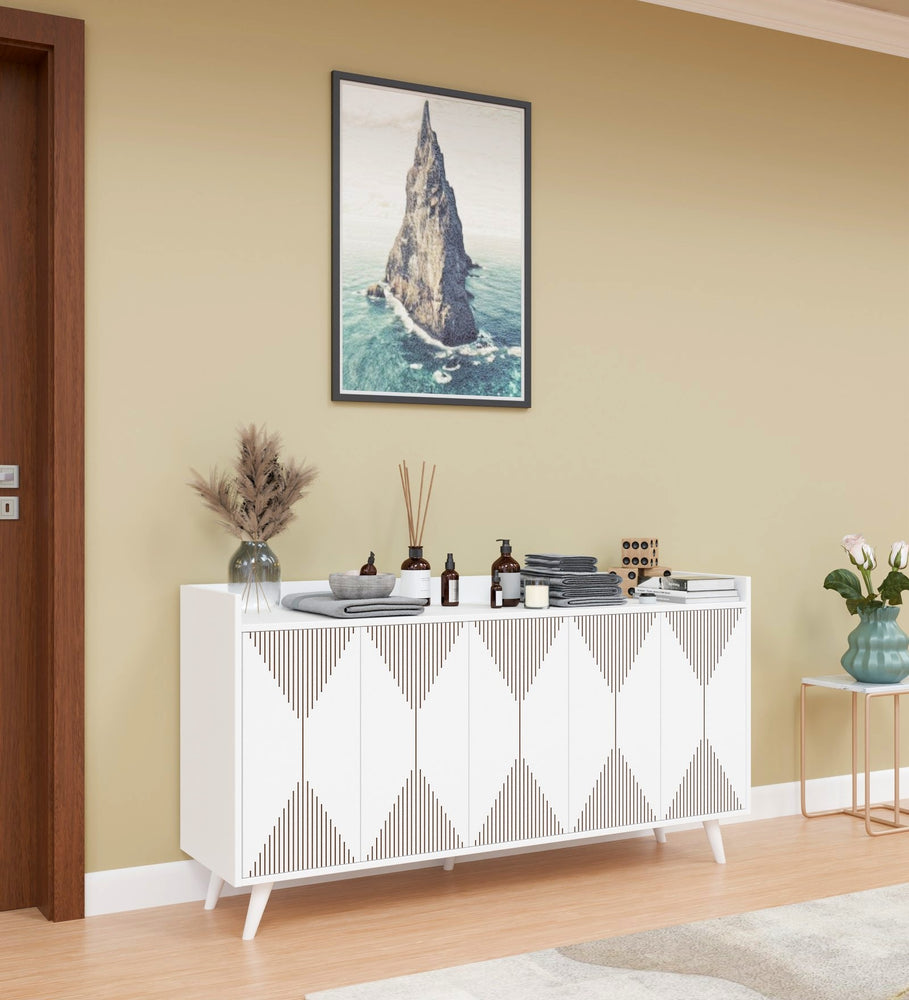 This white console table features a sophisticated geometric pattern on the doors, creating a modern and stylish statement piece for your living room, hallway, or dining area.