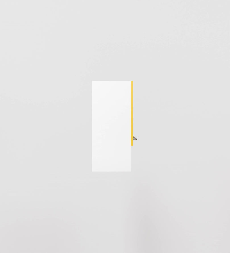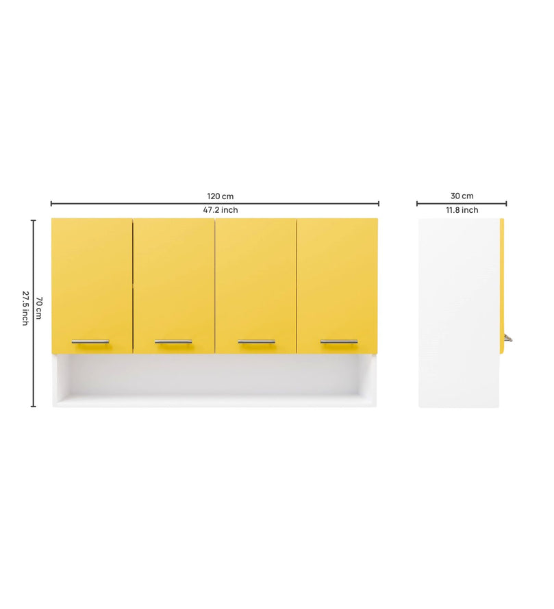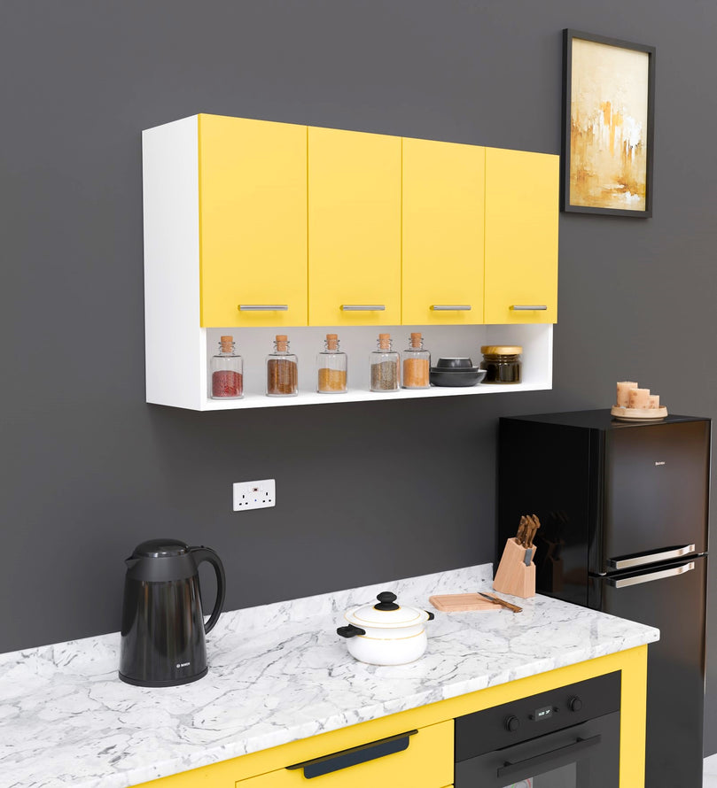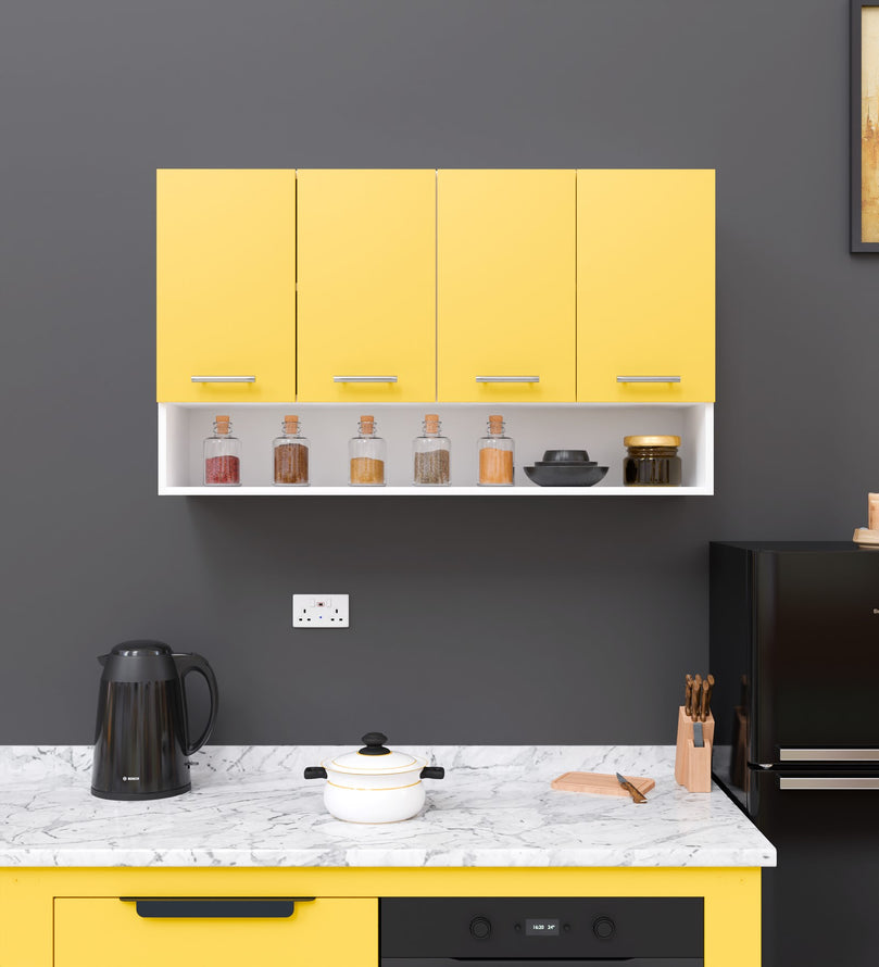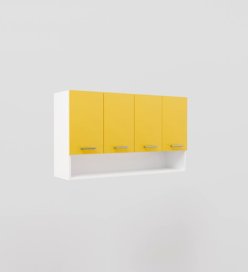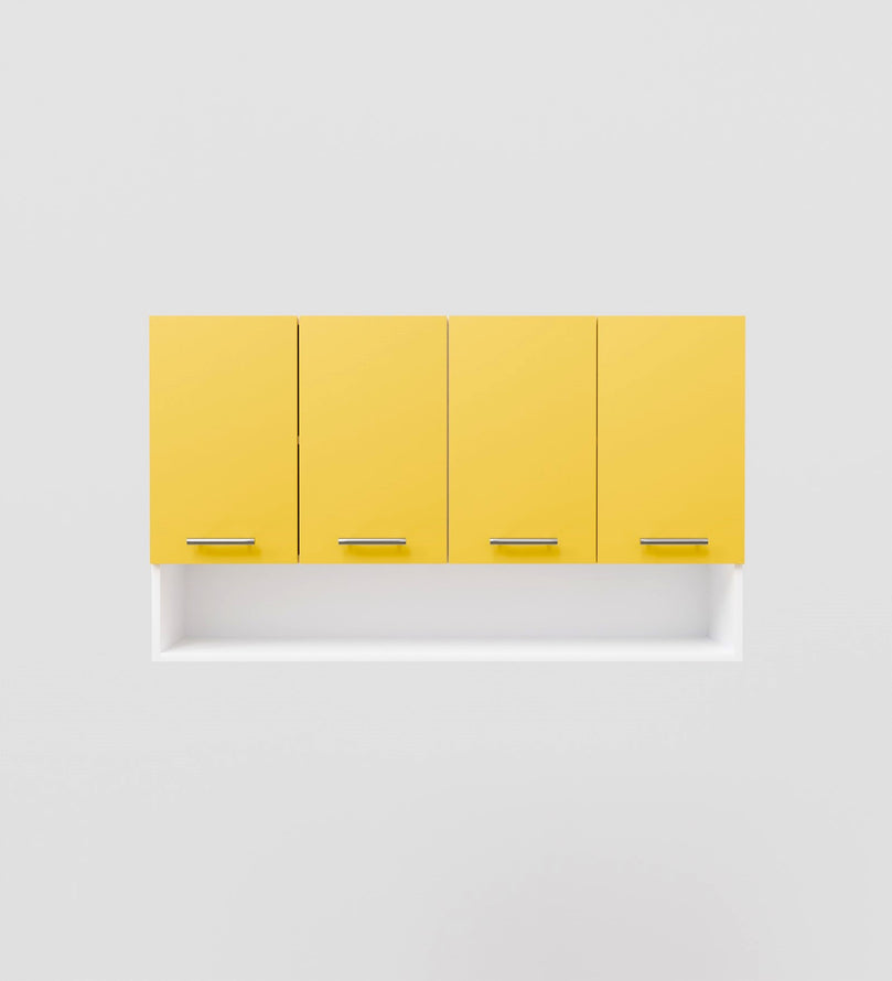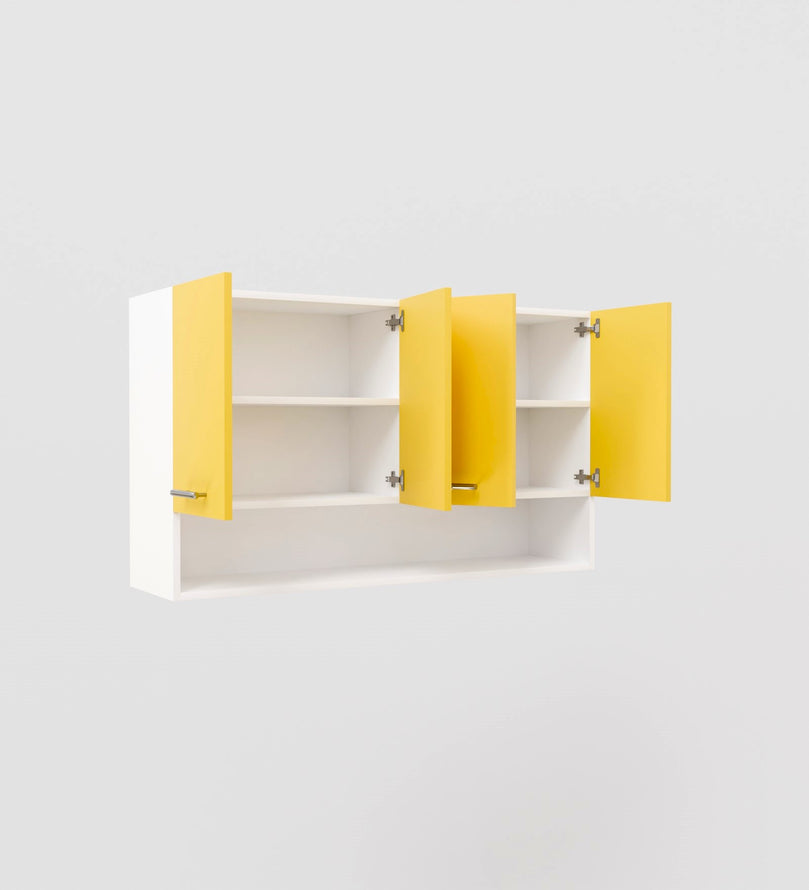 This contemporary kitchen setup features a streamlined wall-mounted cabinet with four doors, providing ample storage space for various kitchen essentials. The cabinet doors are complemented by minimalist handles that ensure easy access to the interior, combining functionality with a modern aesthetic.