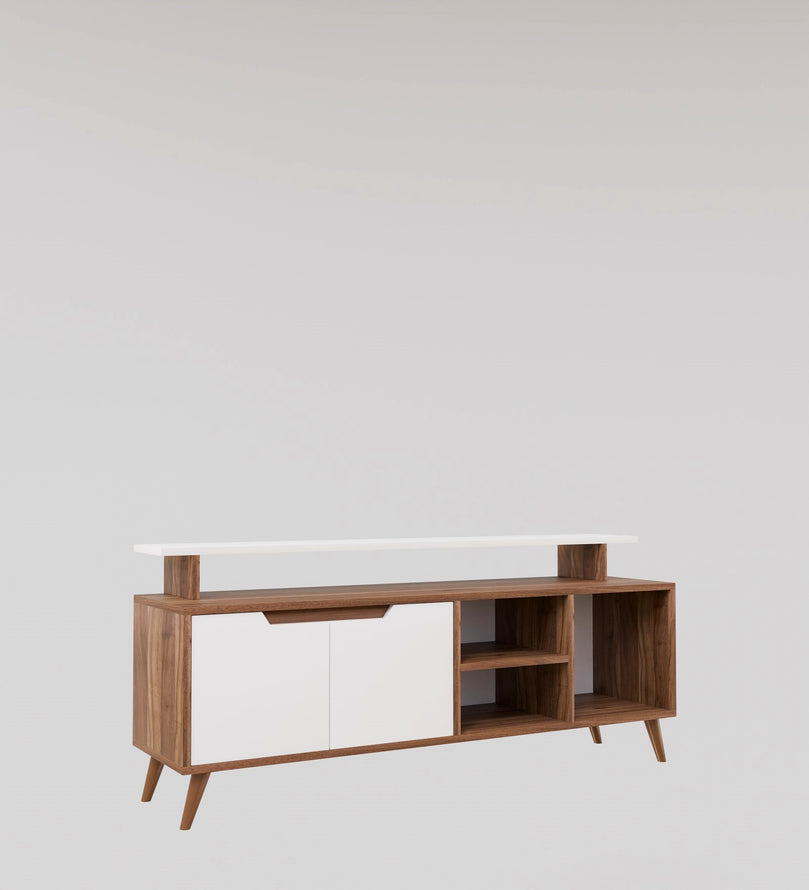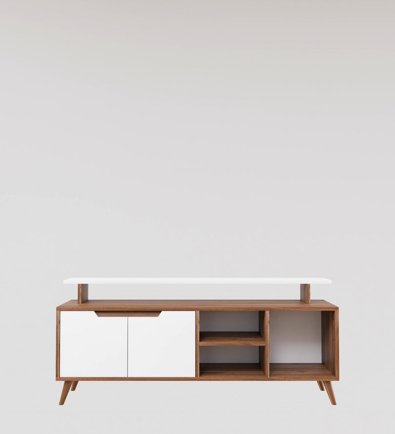 Enhance your living room with the sleek and stylish Rhodium TV Unit, designed to blend functionality and modern aesthetics effortlessly. This TV stand features a minimalist design with a wooden finish and a striking combination of white doors and natural wood grain, creating a perfect balance of contemporary and classic. The compact structure makes it suitable for various living spaces, whether it’s a cozy apartment or a spacious home.