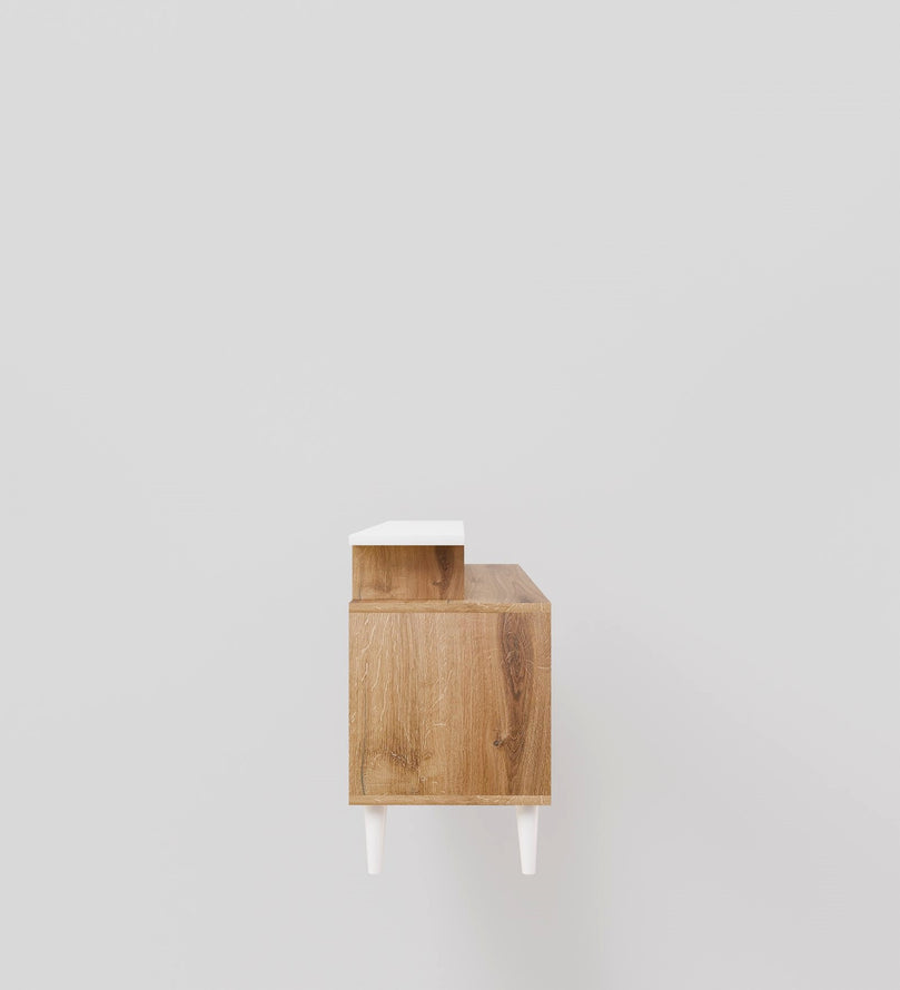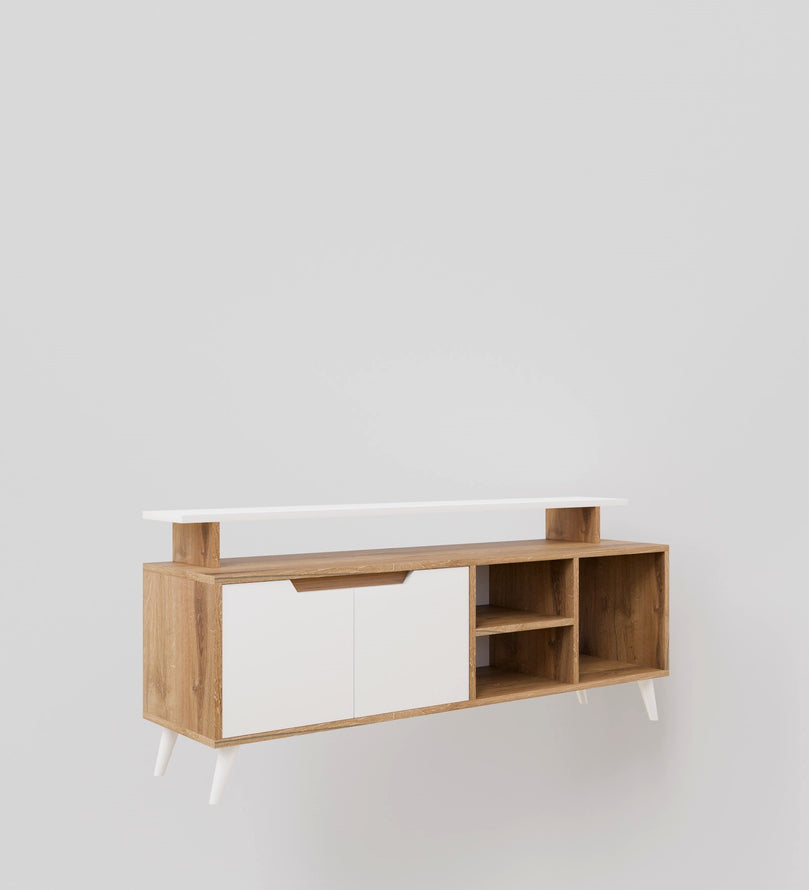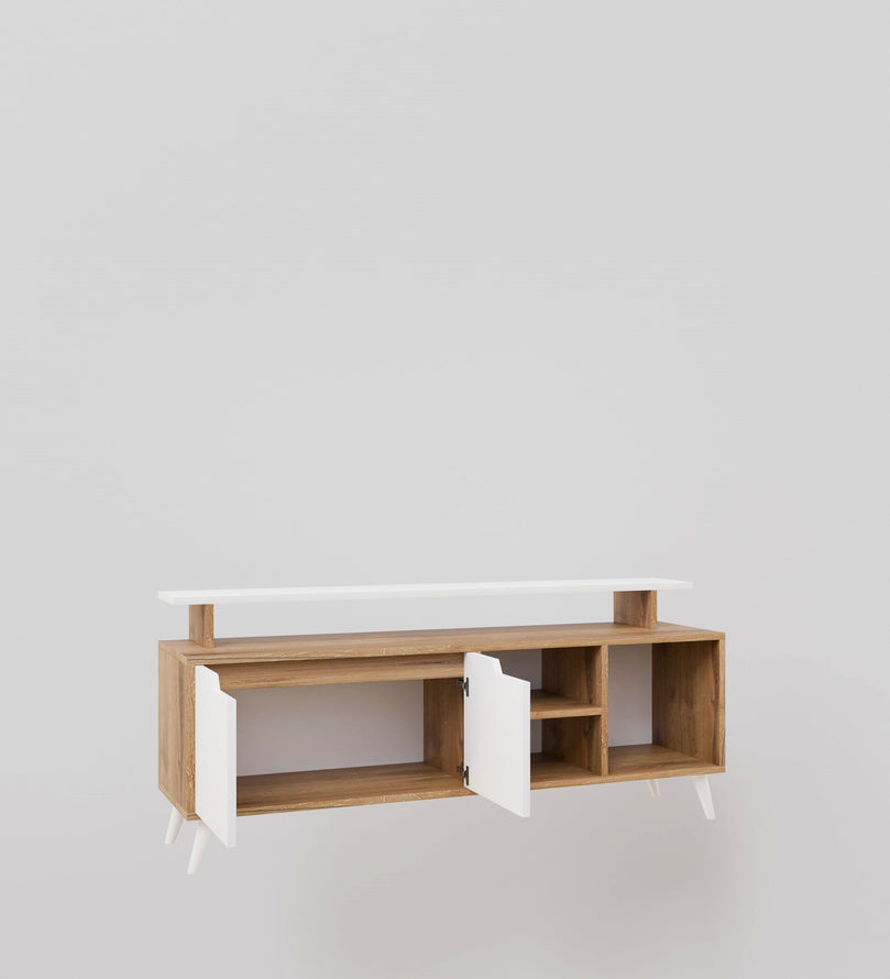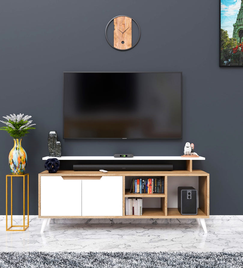Enhance your living room with the sleek and stylish Rhodium TV Unit, designed to blend functionality and modern aesthetics effortlessly. This TV stand features a minimalist design with a wooden finish and a striking combination of white doors and natural wood grain, creating a perfect balance of contemporary and classic. The compact structure makes it suitable for various living spaces, whether it’s a cozy apartment or a spacious home.