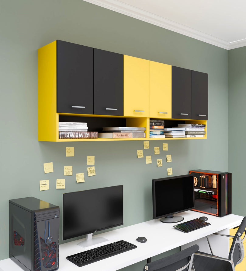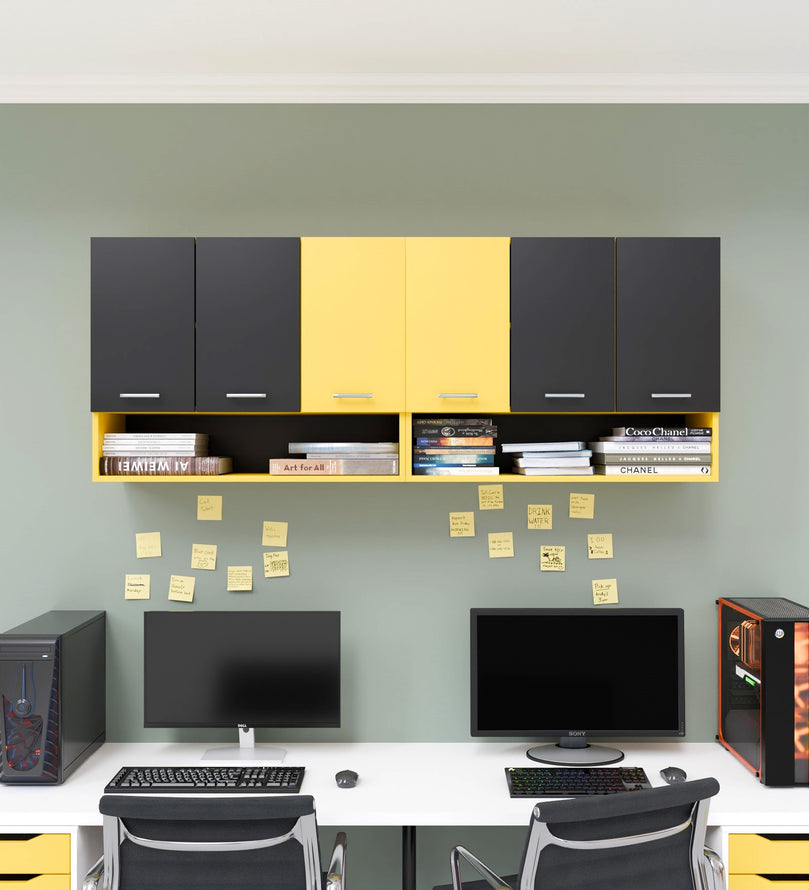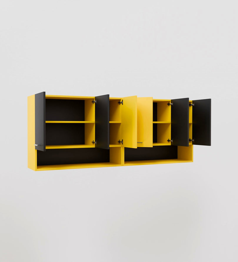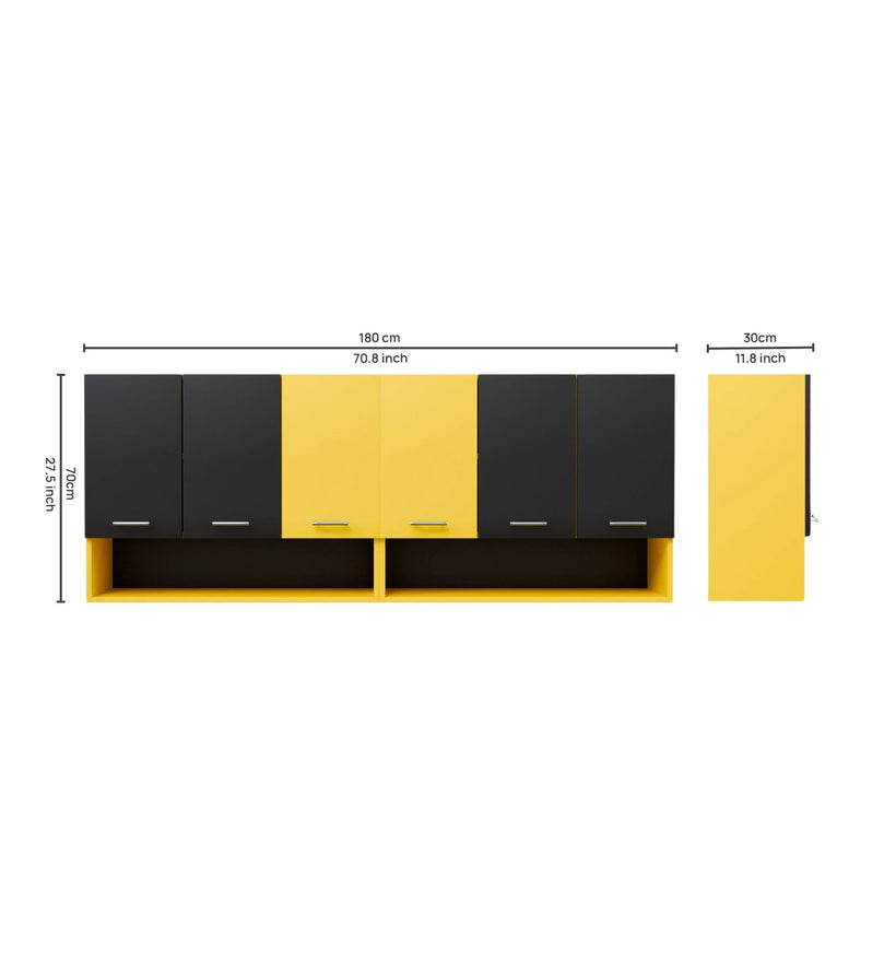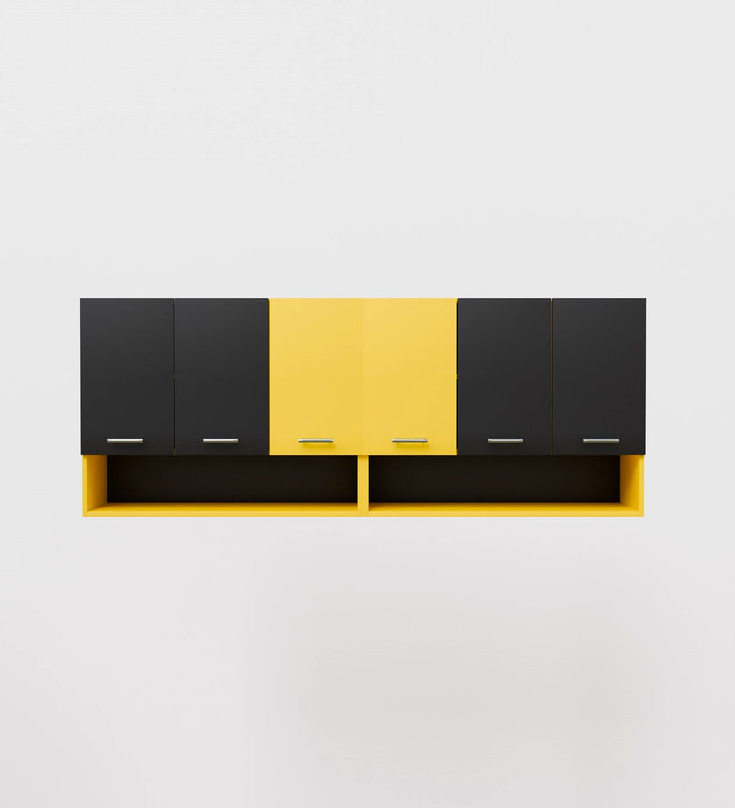 Sleek Design: The cabinet features a matte black and yellow finish with open shelves, giving it a contemporary and minimalistic look that will elevate the aesthetic of your kitchen.