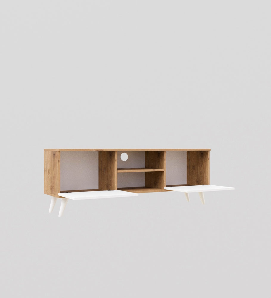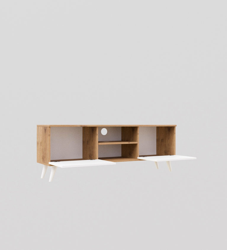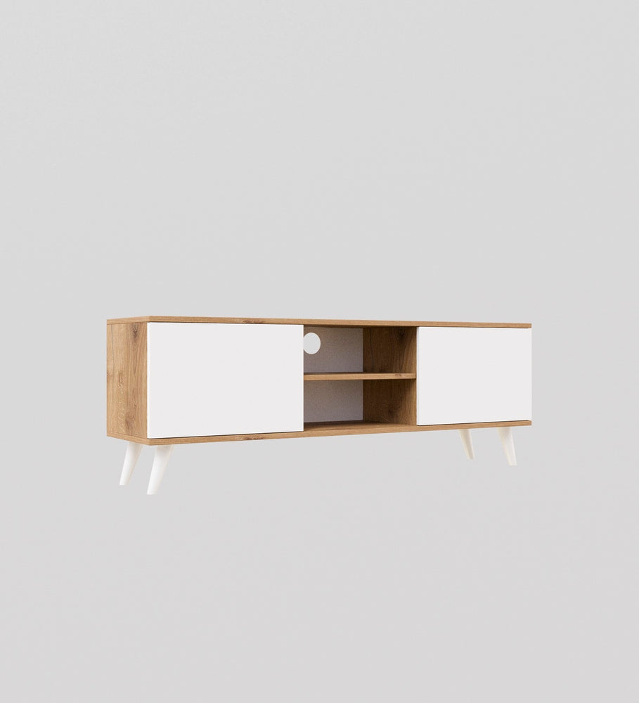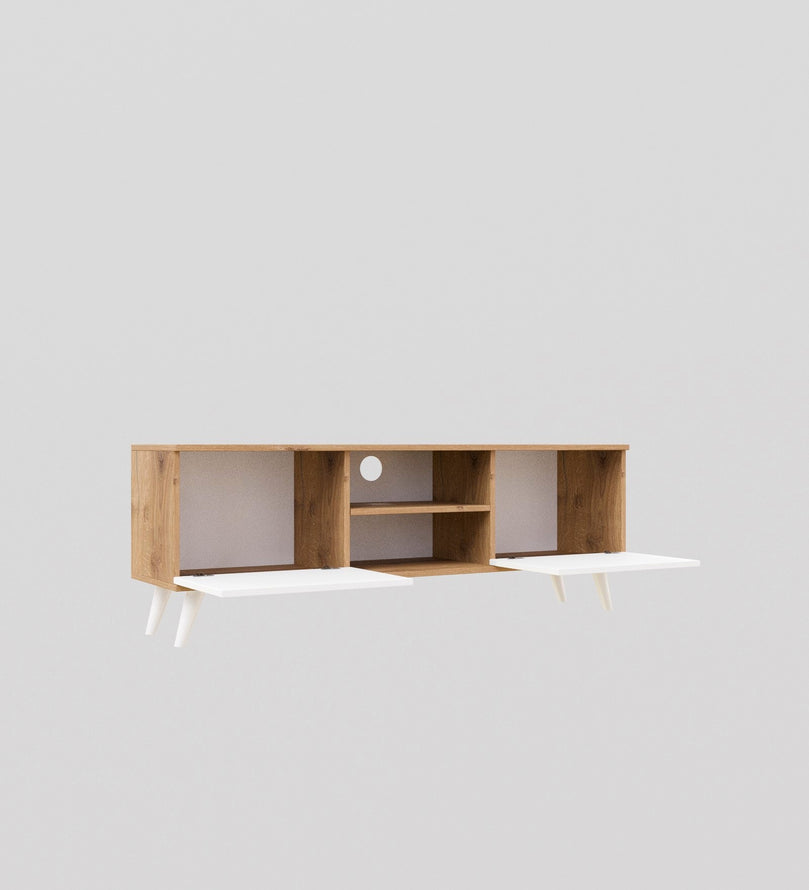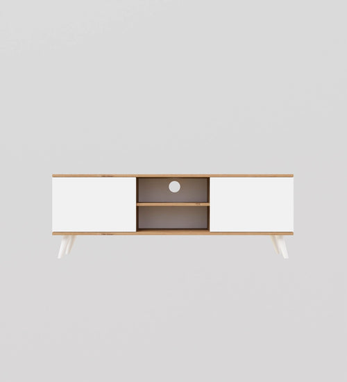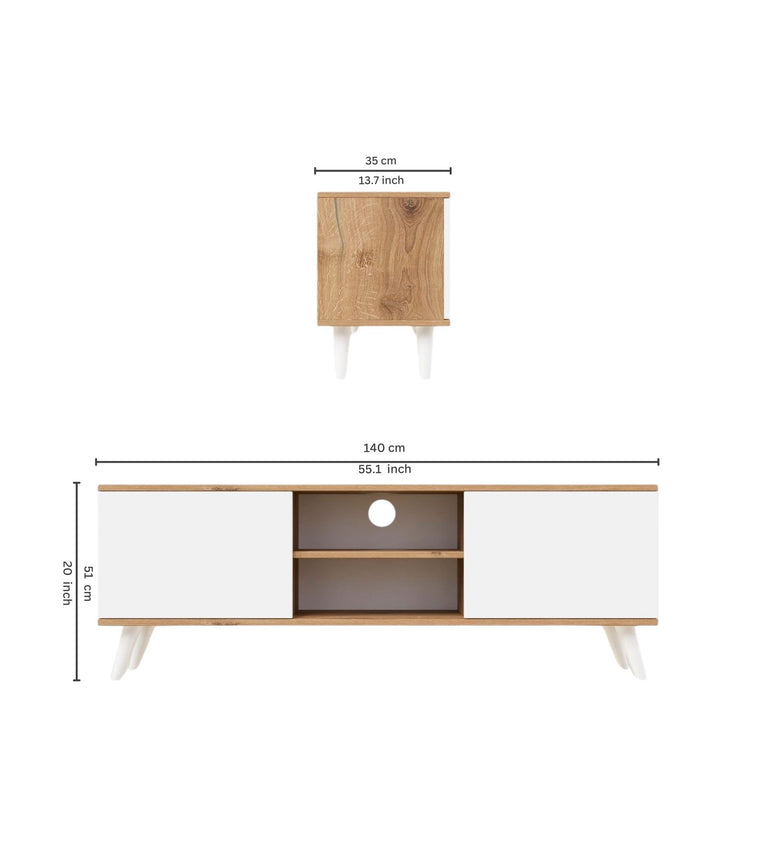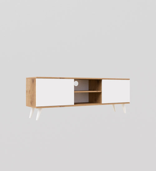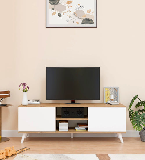 Modern TV Unit in Canyon Oak and White Finish | 140 cm Entertainment Center with Open Shelf & Storage Cabinets