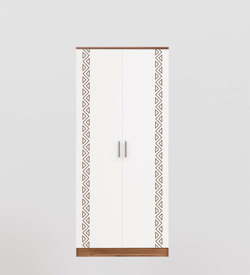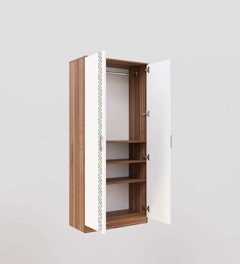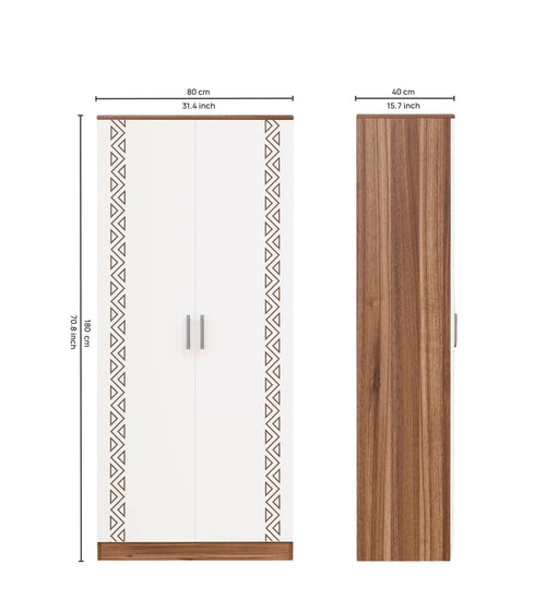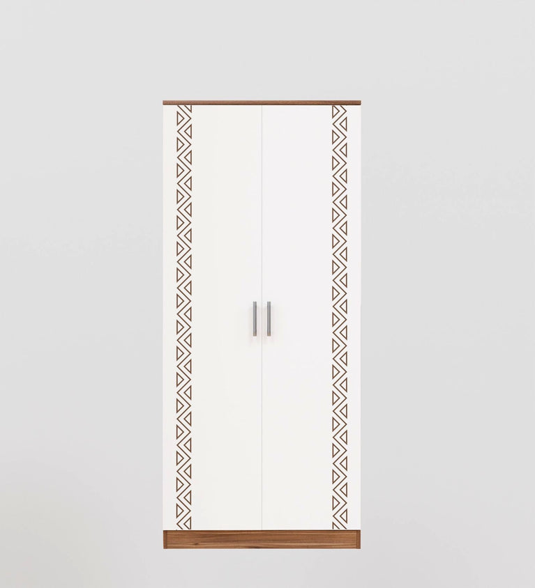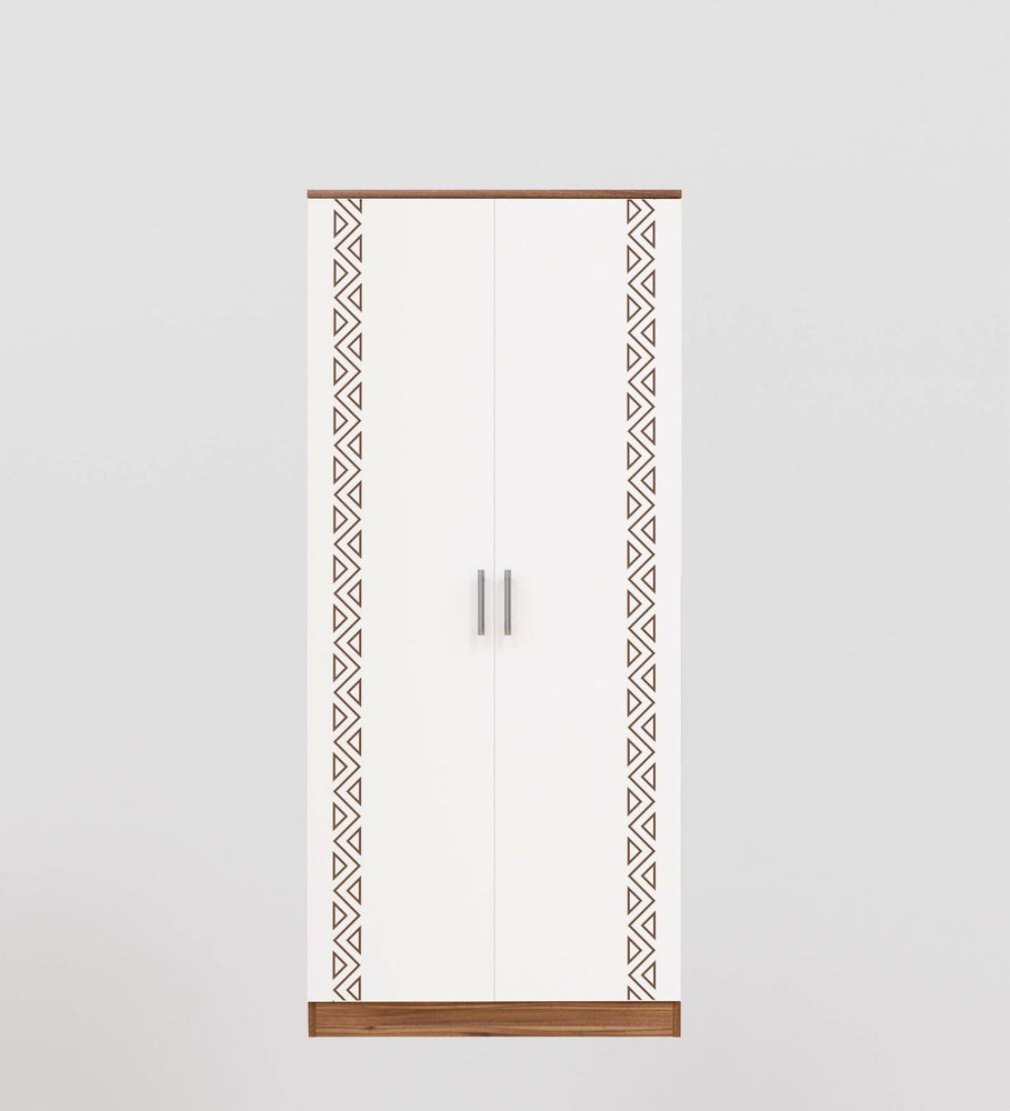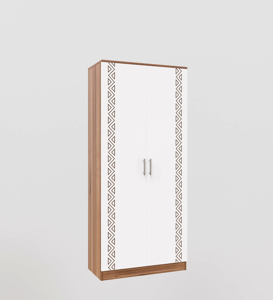 Add warmth and sophistication to your space with this 2-door wardrobe in a chic Noce Lyon wood grain and crisp white finish. Featuring subtle tribal-inspired patterns along the doors, this wardrobe offers both charm and utility—perfect for modern and earthy interiors alike.
